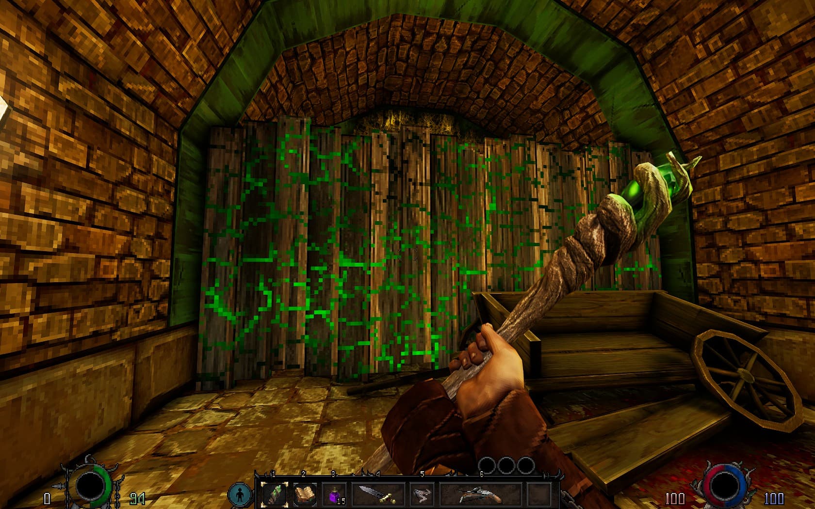 Зеленый камень в посохе позволяет ломать определенные стены. Возможно, эта идея получит развитие, и в игре появятся другие камни и типы препятствий.