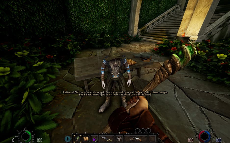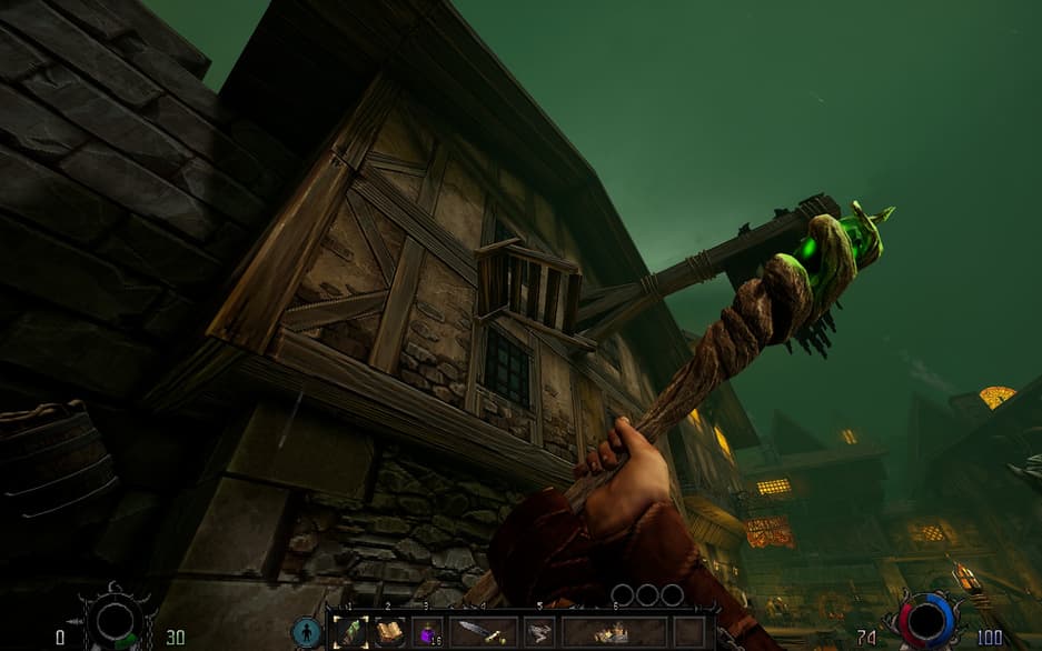 Здесь есть элементы, напоминающие Dark Messiah или Arx Fatalis — их мало, но они есть. Например, необходимость взаимодействия с окружением. Оно позволяет получить преимущество или просто продвинуться вперед по локации. Есть элемент метроидвании. Новые маршруты на карте открываются с обретением новой способности. Есть попытка добавить побочные задания, есть мирная локация-хаб с продавцом оружия, есть инвентарь и место для артефактов, которых пока в Graven нет.