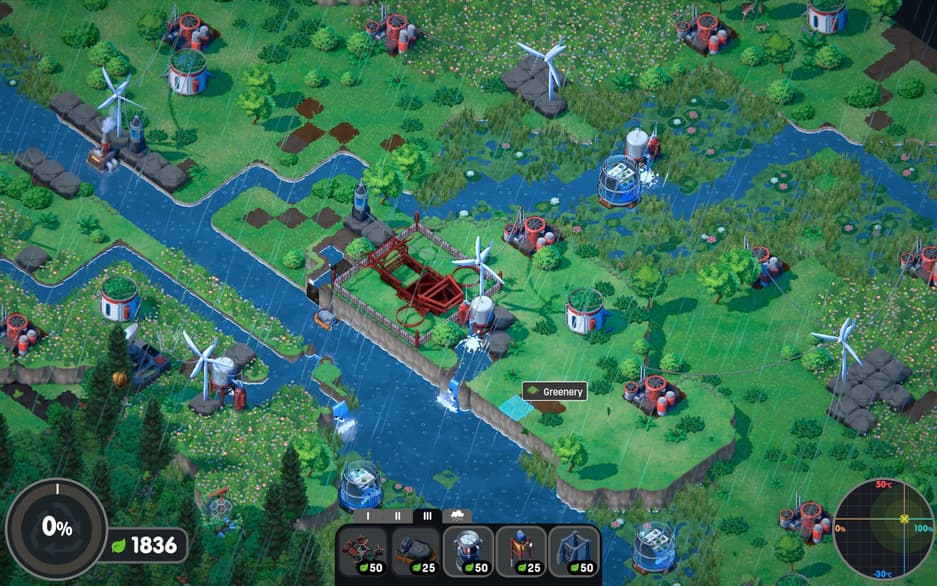 Казуальная стратегия про терраформирование погибшей Земли. Прохождение делиться на несколько этапов: озеленение токсичной атмосферы и грунта, наполнение рек; создание биомов для жизни разных видов животных; постройка летающего корабля и уничтожение всех следов цивилизации. Важно создать идеальную температуру, чтобы начался круговорот воды в природе. Карта для застройки генерируется случайно, так что даже в демоверсии Terra Nil можно зависнуть надолго.