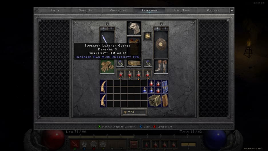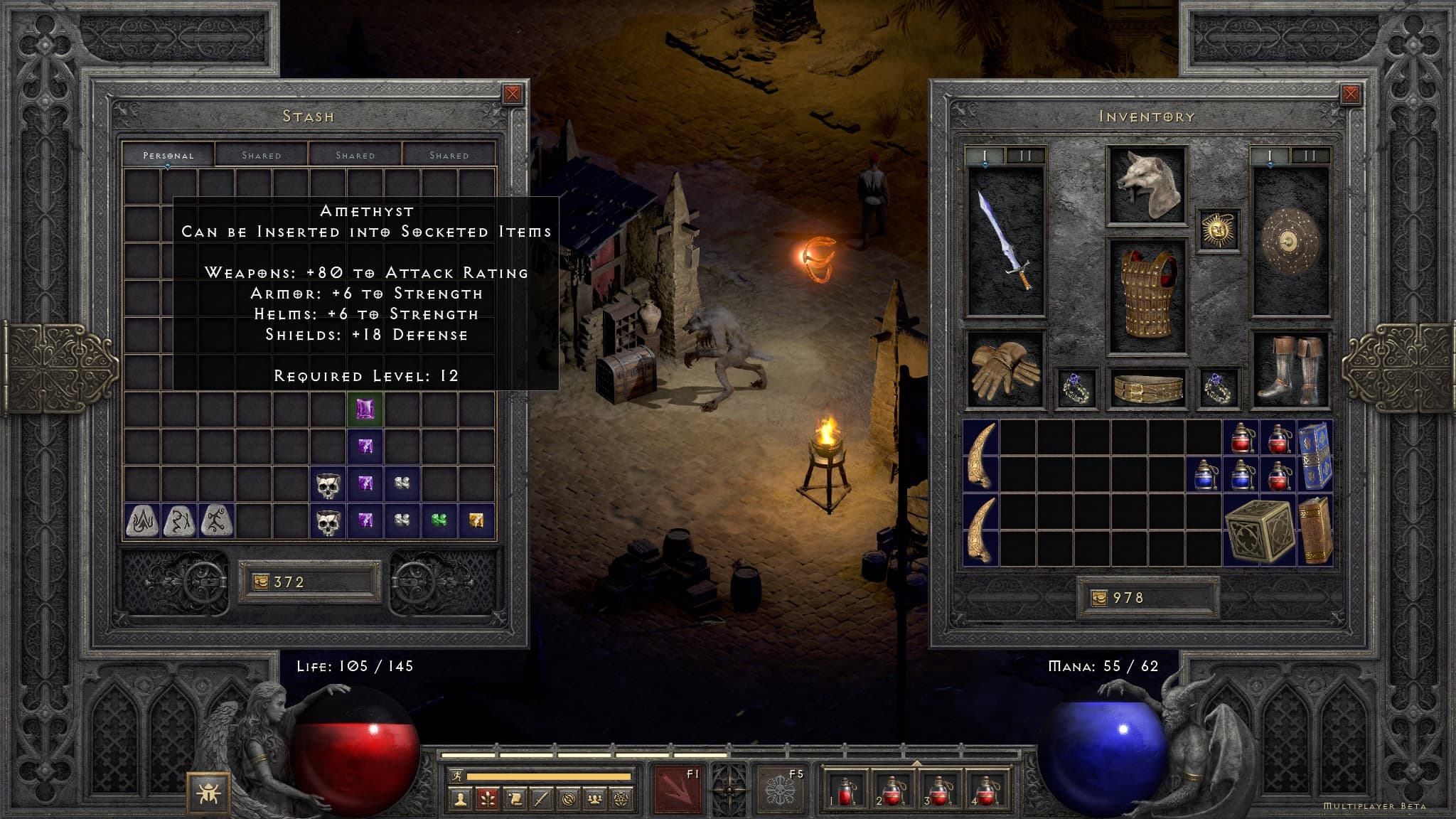 Естественно, почтенный возраст скажется на первом впечатлении, если с оригиналом вы не знакомы. Diablo 2 – игра практически медитативная, с неспешным ритмом, по сравнению с более динамичными последователями. Здесь масса устаревших механик и вещей, которыми разработчики стараются не обременять аудиторию уже много лет, наподобие свитков распознавания предметов, архаичного управления запасами и сверхаккуратного внимания к построению билда. Есть и предметы, существование которых в высшей степени сомнительно – бутылочки выносливости и оттаивания, ключи, стрелы и другое.