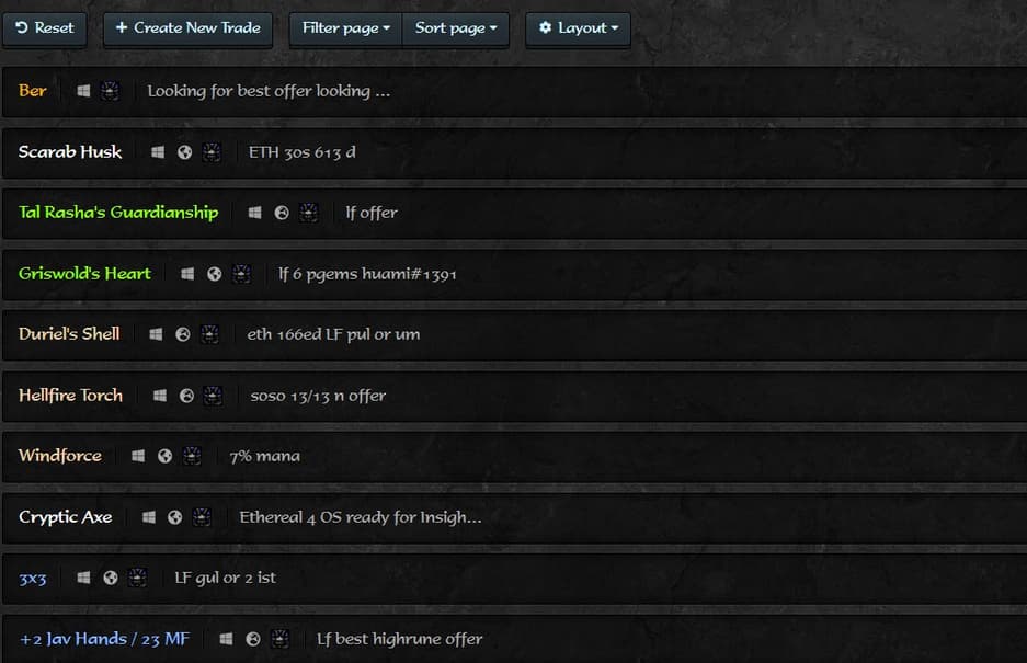 Стоит обратить внимание, что ценятся не только уникальные и сетовые вещи, руны, обереги (Charm), самоцветы (Jewel), драгоценные камни, но и некоторые обычные вещи, бесплотные вещи (Ethereal) и вещи с определённым количеством гнёзд. С этим лучше разобраться пораньше.