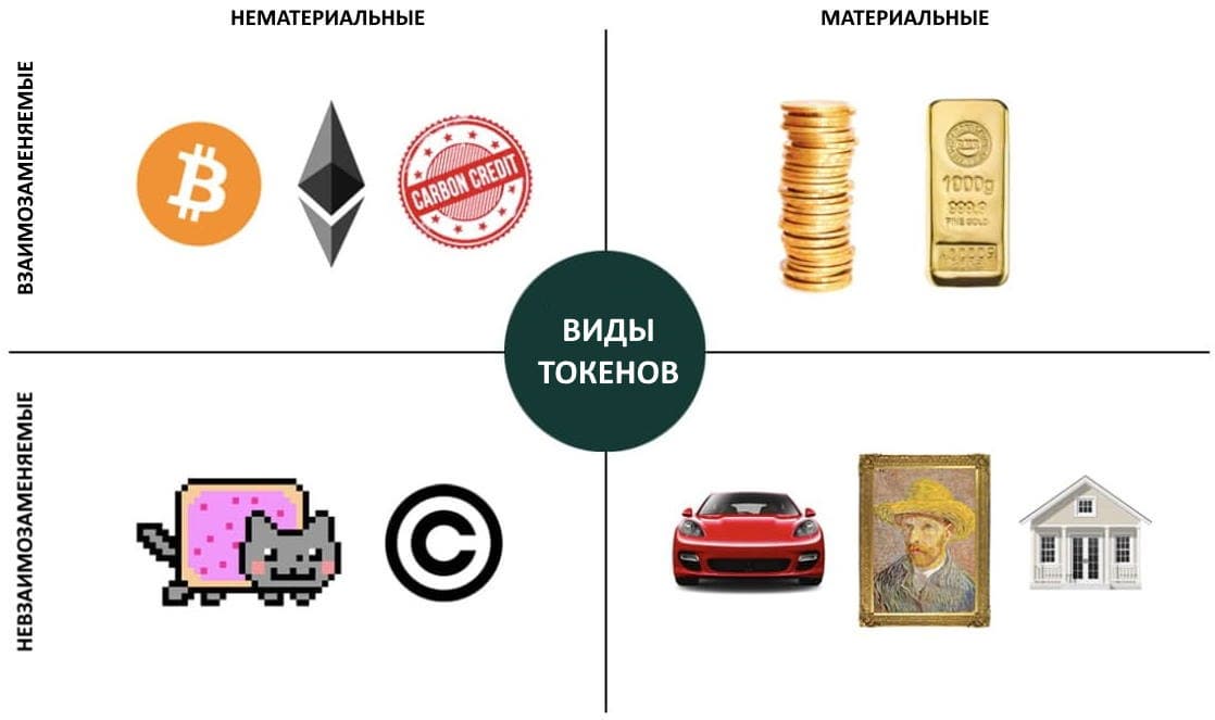 Токены — это цифровые единица учета ресурсов. Причем ресурсы могут быть как материальными, физически существующими в реальном мире, так и нематериальными. Токены, обеспеченные материальными ресурсами, представляют собой цифровой эквивалент каких-либо товаров, объектов или эквивалент в традиционных валютах. Т. е. существуют токены, эквивалентные 1 доллару США или 1 российскому рублю, 1 грамму золота или 1 токен, эквивалентный конкретному существующему произведению искусства или объекту недвижимости. К нематериальным ресурсам относится криптовалюта, интеллектуальная собственность, лицензии на авторское право, цифровые изображения.