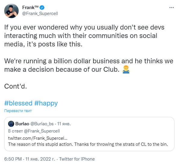 Еще до разгоревшегося скандала в одном из сообщений в твиттере, глава разработчиков Фрэнк привел возмущенный пост игрока с таким комментарием: «Если вам интересно, почему обычно разработчики активно не общаются с сообществом в социальных сетях, то это из-за таких сообщений. У нас бизнес на миллиард долларов, а он думает, что мы принимаем решения из-за нашего клуба». Так нерадивые хозяева учат котенка не гадить, где попало, тыкая носом в кучу дерьма.