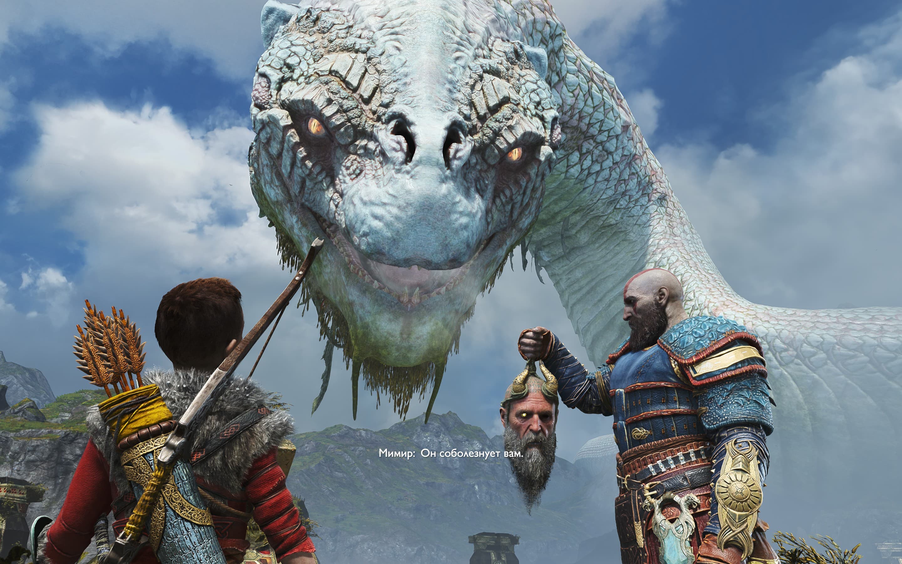 Умнейший из людей, Мимир, ещё с God of War 2018 на стороне греческого бога войны и его сына. И немудрено — Один заточил его в дерево и обрёк на вечные мучения за предательство. Кратос же, ловким взмахом топора, освободил и буквально привязал голову Мимира к себе. Но в мифологии умнейший из людей даже в Рагнарёк помогал Одину советом и видениями будущего.
