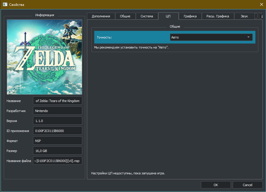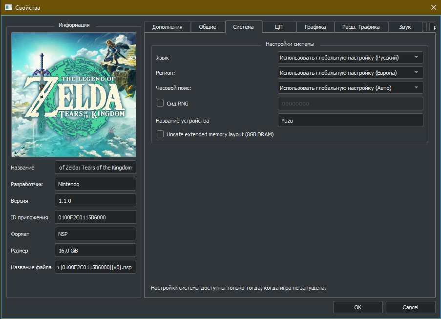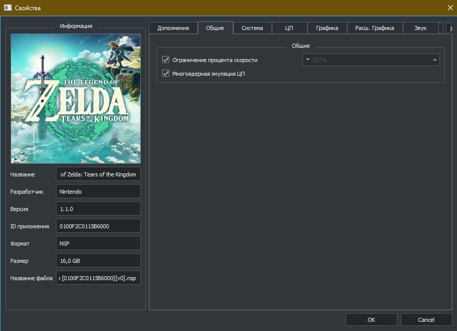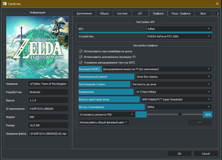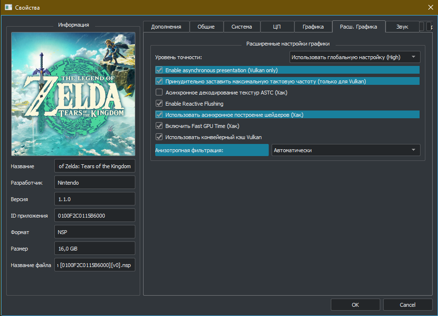 С настройками для The Legend of Zelda: Tears of the Kingdom всё ещё проще: сообщество нашло около-идеальный пресет. Настройки внутри эмулятора меняются через пункт «Эмуляция» на верхней панели Yuzu и окно «Параметры». Однако настройки на скриншотах произведены непосредственно для игры в окне «Свойства».