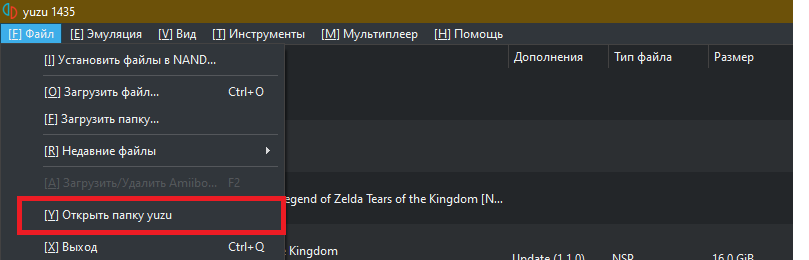 - Выберите на верхней панели Yuzu пункт «Файл». В выпадающем окне нажимайте на «Открыть папку Yuzu» — она откроет внутренние файлы эмулятора;