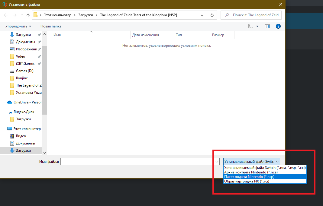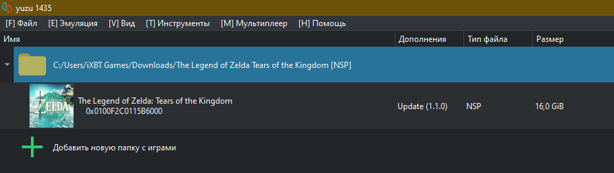 Теперь нужно подсказать эмулятору, где расположена наша игра. Два раза кликаем на зелёный плюсик в окне Yuzu с надписью «Добавить новую папку с играми» и ищем место, где находится образ The Legend of Zelda: Tears of the Kingdom. У меня это стандартный путь к папке «Загрузки» на системном диске — у вас он может отличаться. Если всё сделано правильно — игра отобразится.
