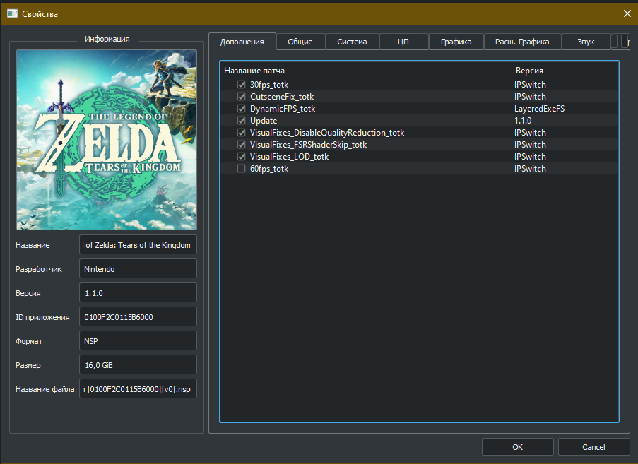 - DynamicFPS — включает динамическую частоту кадров во время эмуляции. Если частота кадров упадёт ниже заданной, то Tears of the Kingdom больше не будет терять скорость эмуляции.