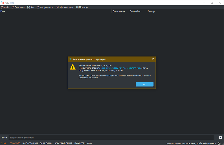 При первом запуске появится ошибка — отсутствуют ключи шифрования. Они необходимы для того, чтобы запущенная игра думала, что мы играем на Nintendo Switch и заработала.