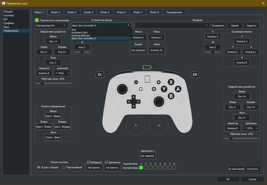 Настройки управления придётся менять в окне общих параметров («Эмуляция» — «Параметры»). Скриншот ниже — пример настройки геймпада от Xbox One. Эмулятор работает с DualShock, DualSense и Nintendo Pro Controller, а также поддерживает функцию гироскопа.