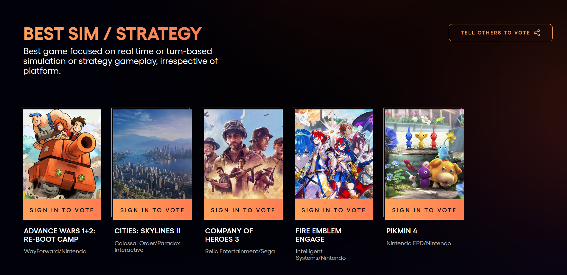 Три игры от Nintendo (!!!) в номинации на «лучшую стратегию», тогда как в этом году вышли: Age of Wonders 4, Jagged Alliance 3, Star Trek Infinite, уже упомянутая Shadow Gambit от Mimimi, Spellforce Conquest of Eo, The Great War Western Front от легендарной Petroglyph. Ну что за глупость, засовывать в номинацию PC-жанра исключительно PC-проекты! Ставим только те игры, которые есть на консолях!