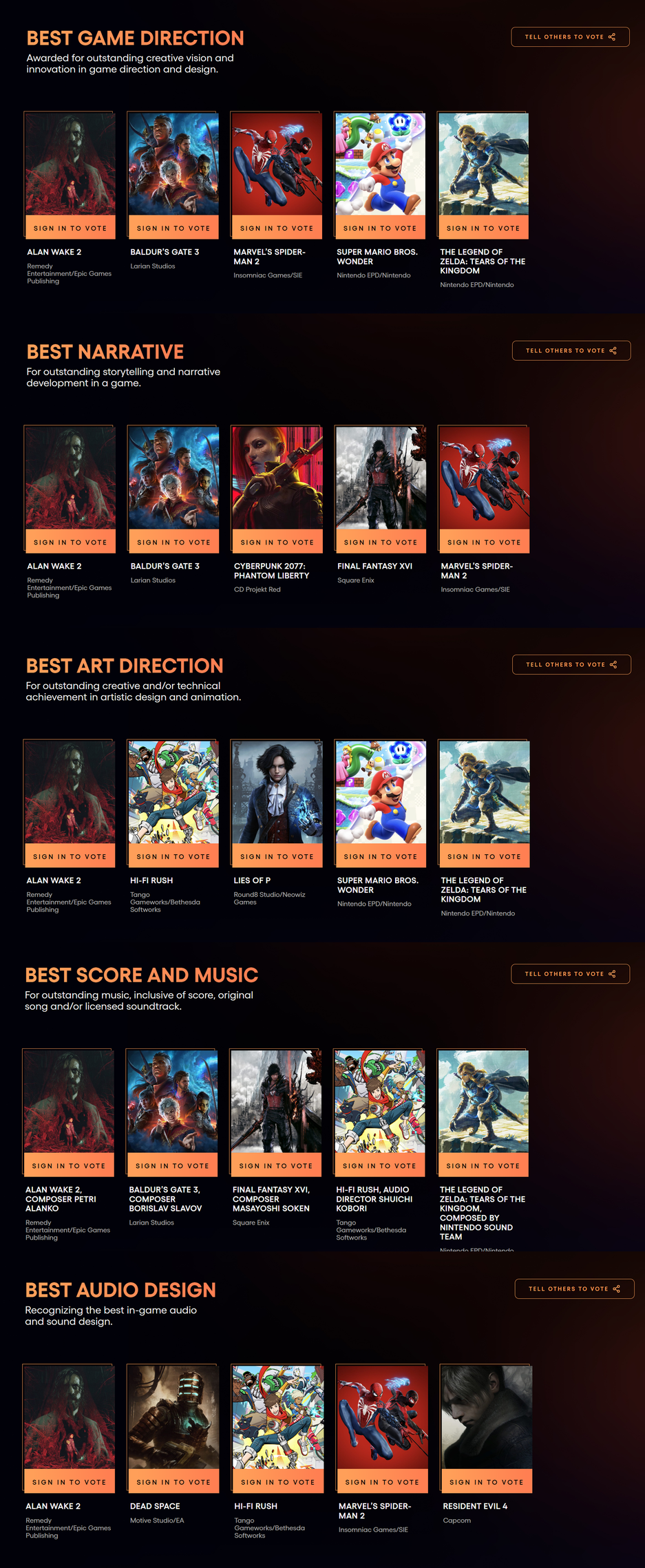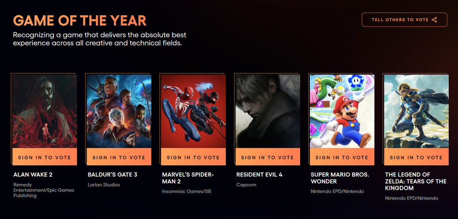 Основа всегда одна и та же: Alan Wake 2, Baldur’s Gate 3, игры Nintendo, а также Marvel’s Spider-Man 2 и ремейк Resident Evil 4 — к ним просто подмешивают один-два проекта из других номинаций и выбрасывают лишние, будто случайно. Вот это разнообразие и подход к отбору!