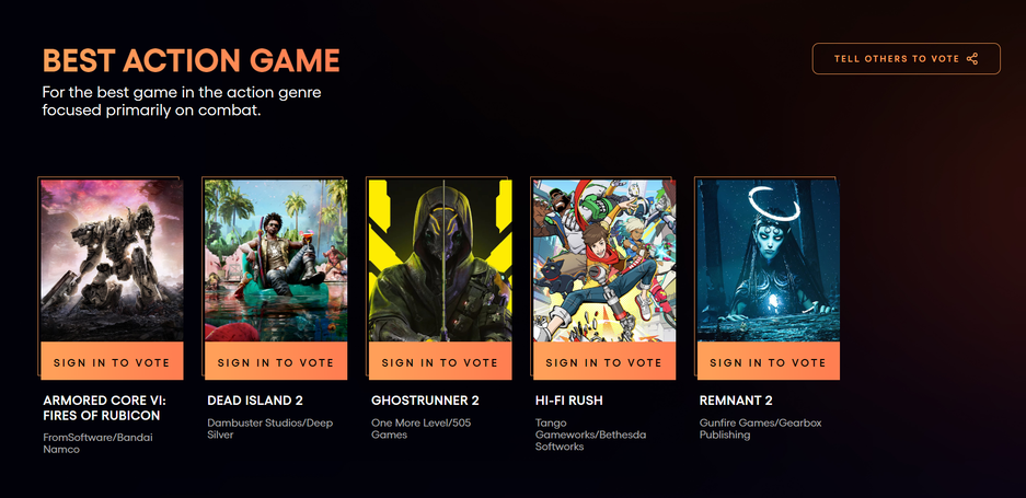 «Игрой года» стала посредственная Elden Ring, которую Джефф Кили упорно рекламировал на собственных презентациях. Показ первого трейлера состоялся на The Game Awards 2021, а показ трейлера Armored Core VI от From Software закрывал The Game Awards 2022 — и теперь игра номинирована на «лучший экшен 2023 года»!