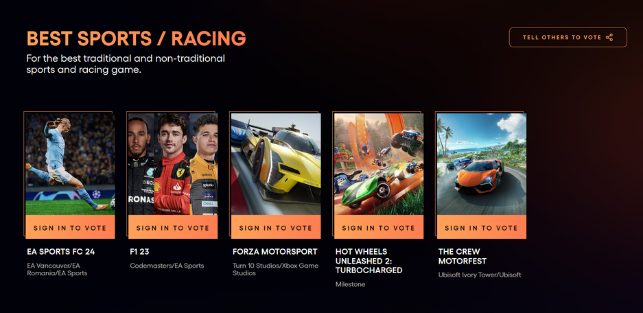 Лучшая спортивная/гоночная игра, где представлены проекты с «традиционными и нетрадиционными видами спорта и гонок»: