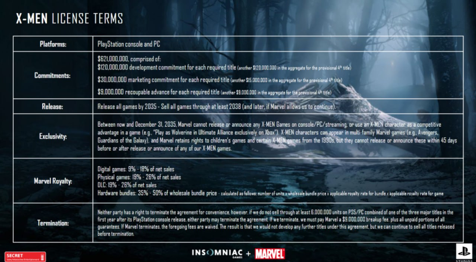 Также в сеть утекли и детали соглашения с Marvel. Так стало известно, что роялти Insomniac составляет от 9% и выше, в зависимости от продаваемого продукта. Кроме того, там имеется пункт о том, что в случае низкого объёма продаж — менее 6 миллионов копий — то к соглашению могут присоединиться другие издатели и/или выписываться штрафы.