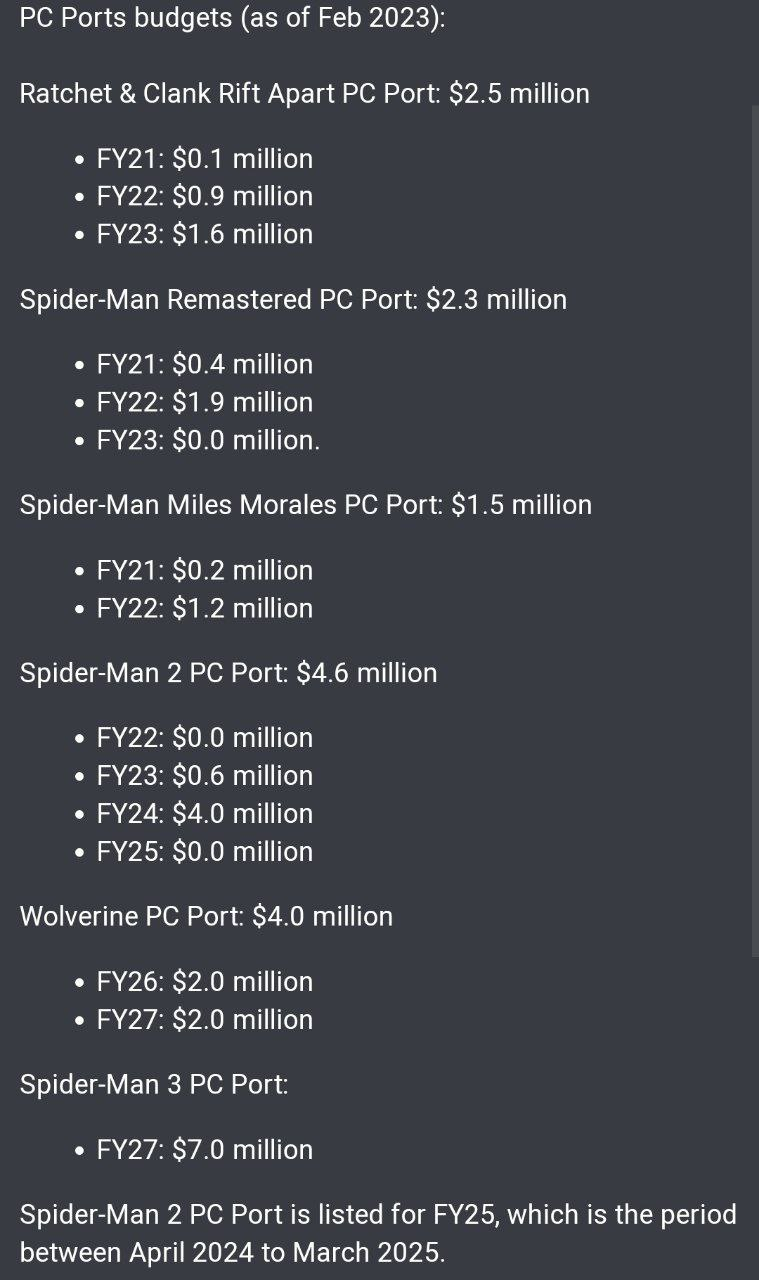 - Цены на портирование оказались смехотворными, по сравнению с основными бюджетами продуктов — в планах компании уже есть расходы на портирование Marvel's Spider-Man 3 и Marvel's Wolverine.
