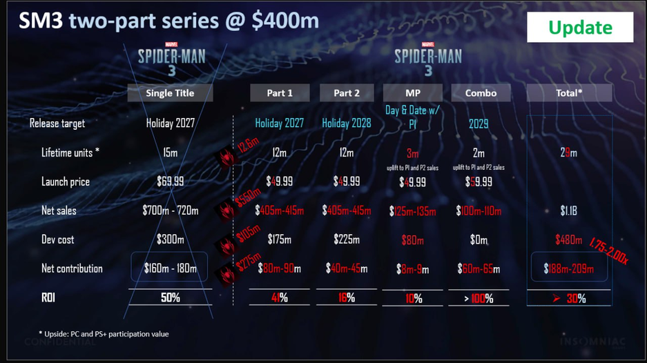 Кроме того, слили данные про расходы и доходы последних игр Insomniac на 1.7 миллиарда оборота, датированные осенью 2023-го года. В таблицу не включены полные доходы с Marvel's Spider-Man, а для будущих игр — прогноз. Основные моменты: окупаемость инвестиций для «Майлза Моралеса» составляет 122% (ROI); Ratchet & Clank: Rift Apart не получил прибыли на момент осени 2022; бюджет «Человека-паука 2» составил 315 миллионов долларов; цифры «Человека-паука 3» и «Росомахи» в таблице приблизительные, но создание обоих игр так же потребует более 300 миллионов долларов бюджета.