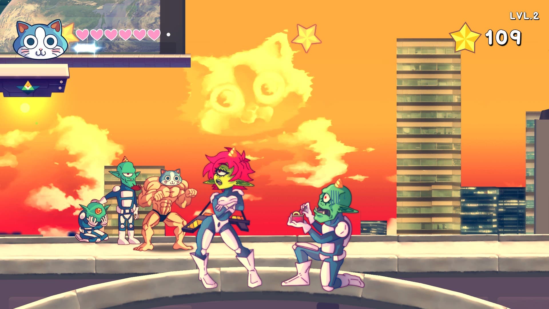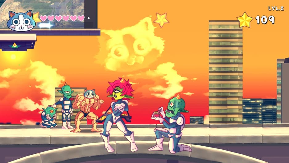 Котик умеет бегать по проводам и лазать по стенам, а мужик, позируя и напрягая мускулы, вырубает пришельцев. Гора мускулов может пойти в качалочку, чтобы тяганием железа повысить уровень. Атмосферу поддерживает творящееся на фоне безумие, и своеобразная музыка. Но топорное управление немного портит общие ощущения от игры.