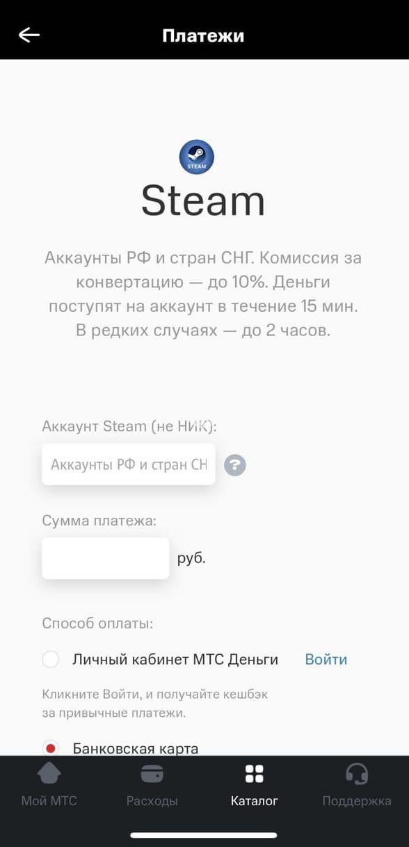 Оператор МТС также предлагает услуги пополнения кошелька Steam через свой сервис мгновенных платежей, однако пользователи сообщают, что иногда система дает сбой, не давая перевести деньги. Минимальная комиссия за услугу составляет 50 рублей, однако временами она может достигать до 26% от суммы пополнения.