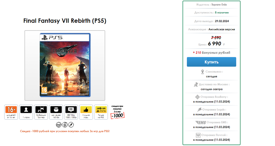 Никто не отменял и покупку физических копий игр, которые продолжают исправно ввозить в страну крупные торговые сети и относительно небольшим магазины. Цена дисков в среднем составляет по 7 тысяч рублей за новинки и где-то 4-5 тысяч рублей за проекты, популярность которых успела отгреметь еще в прошлом году. Магазины также предлагают всякие бонусные программы с накопительными баллами и скидки. Разумеется, такой вариант недоступен владельцам цифровой модели консоли без оптического привода.