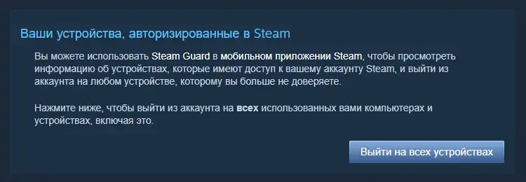Для смены региона вам необходимо выйти со всех устройств, выполнив следующую последвоательность действий: «Настройки» > «Аккаунт» > «Управление настройками Steam Guard» > «Выйти на всех устройствах»: