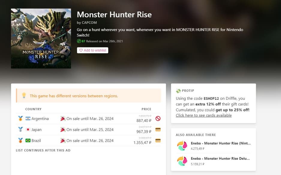 Портал eshop-prices.com позволяет сравнивать цены на игры в различных регионах. Та же Monster Hunter Rise на момент написания этих строк стоит в японском регионе меньше тысячи рублей: