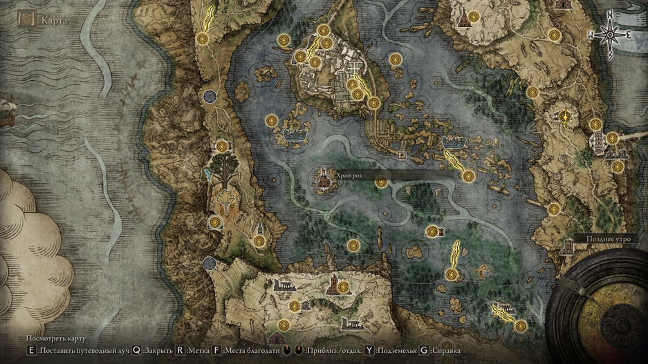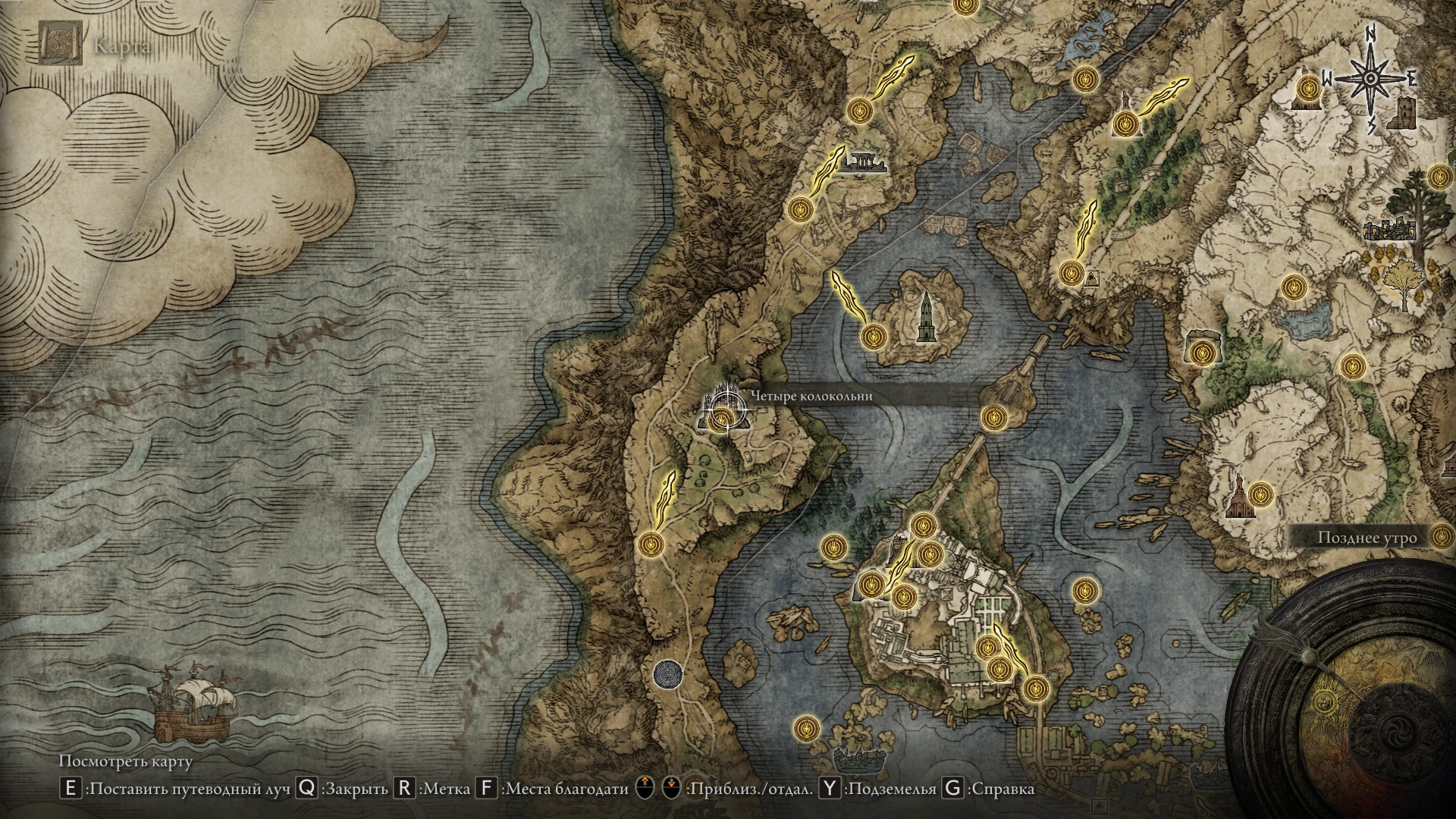 Второй отправит нас на запад Озерной Лиурнии, в локацию Четыре Колокольни. Из четырёх башен, выберите ту, что находится на возвышенности, и откройте сундук — вы получите «Насыщенный мечевидный ключ». Далее идём к башне внизу слева. Там, вставьте ранее полученный ключ в статую беса, дабы активировать портал, что перенесёт вас в Часовню ожидания — самую первую локацию игры.