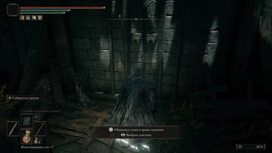 Далее поверните к проходу с двумя статуями, расположенному слева. Пройдя через мост к большому зданию, поднимитесь по лестнице наверх и войдите в церковь. Там вы найдёте уже мёртвую служанку — взаимодействуйте с её телом, выбрав «Обмакнуть ткань в кровь служанки».