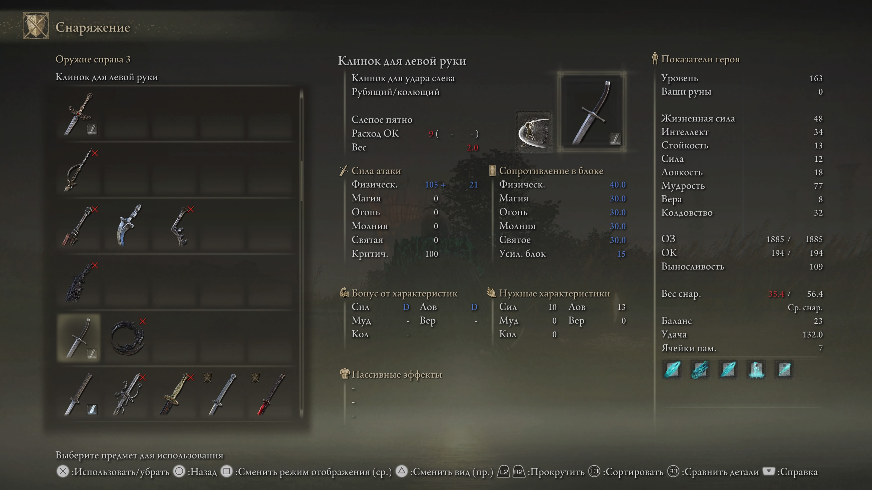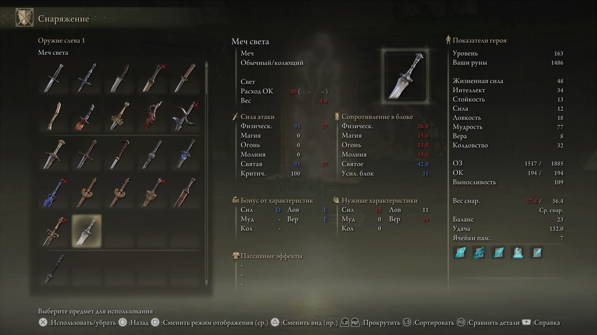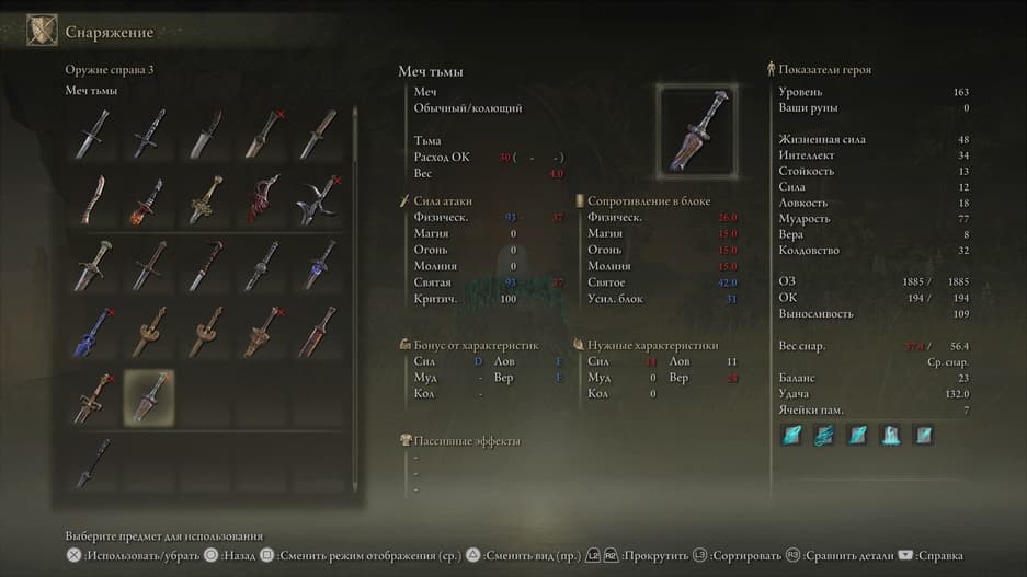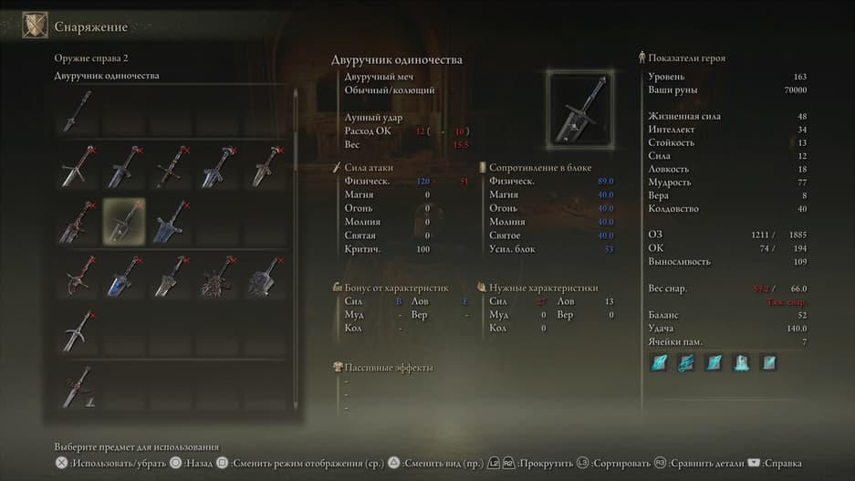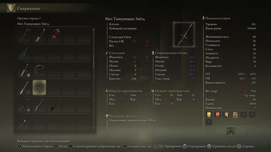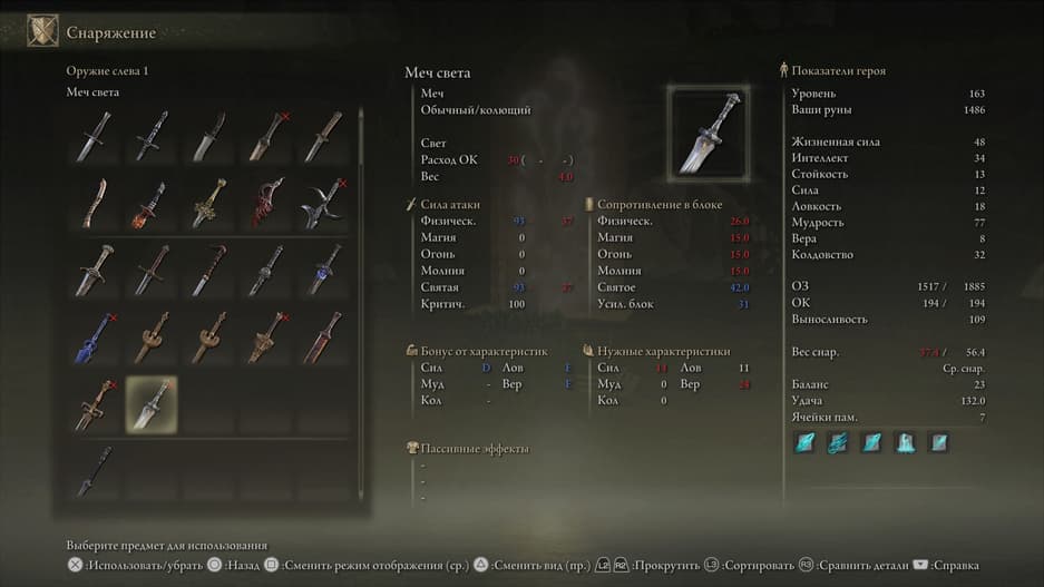 Клинок можно наделить способностью Пепла войны для изогнутых мечей и «заточить» на элементальный урон.