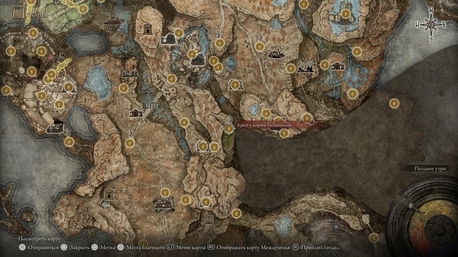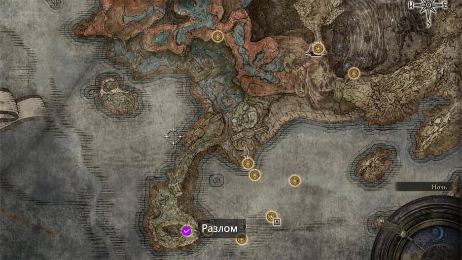 Следующая наша цель — попасть в Разлом. Добраться туда совсем нетрудно, поэтому исследуйте локацию в удобном вам темпе, а я отмечу на карте месторасположение Разлома — пропустить огромную дыру в земле очень сложно.
