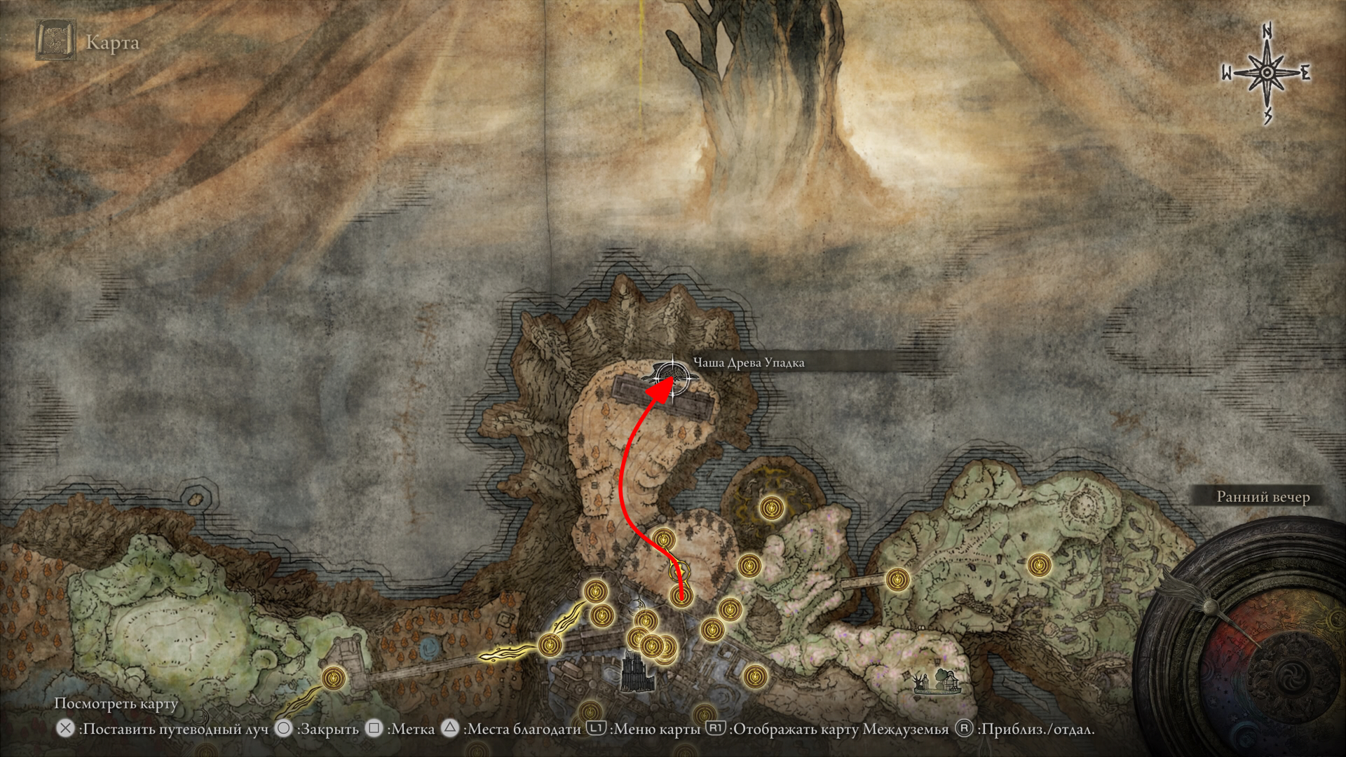 Пройдя в проход наружу от благодати «Пристанище Теней, задние ворота» и, сразив босса Командующий Гай, поверните налево и бегите вперёд и на север, пока не доберётесь до локации «Чаша Древа Упадка» — возле неё вас ждёт сразу пять осколков.