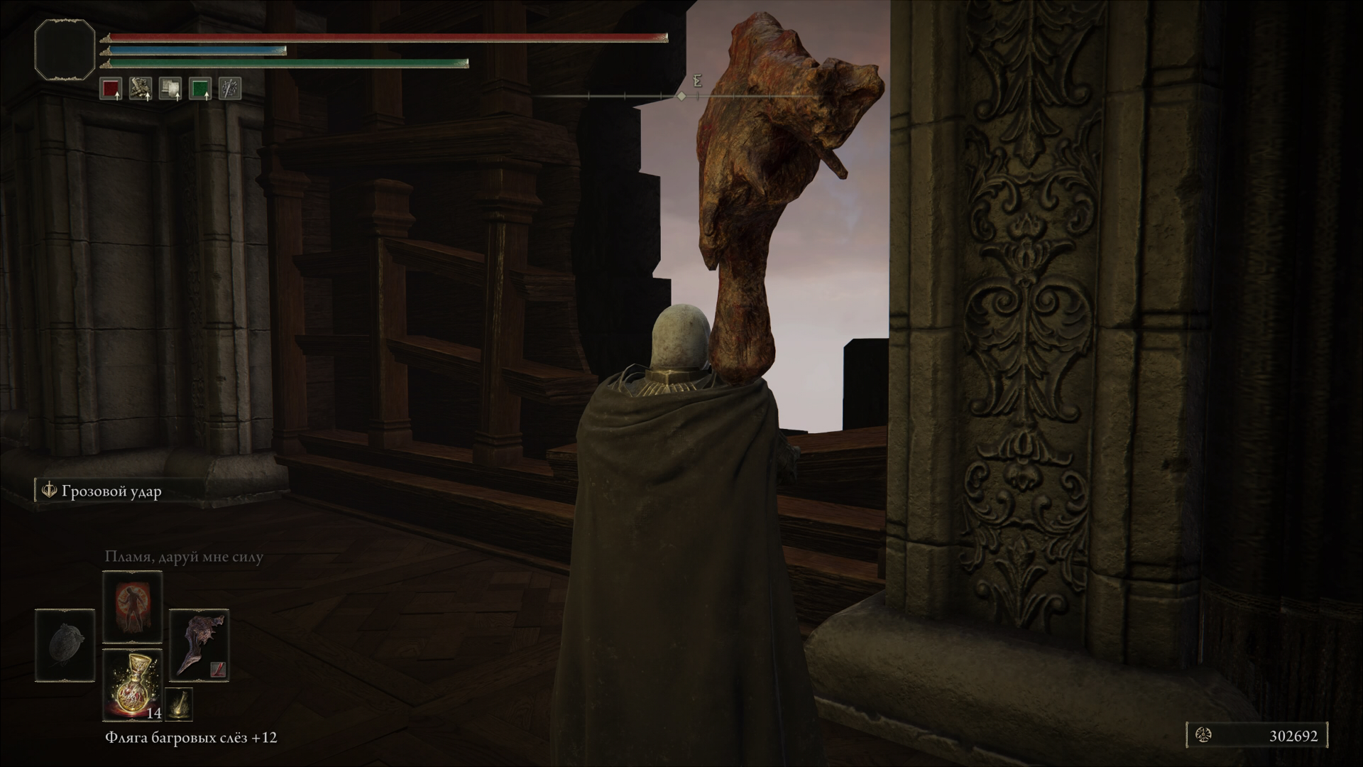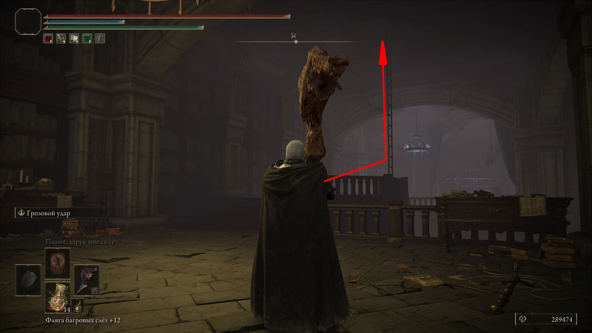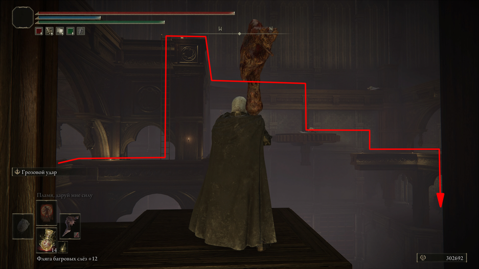 Чтобы добраться до этой благодати, необходимо от благодати «Хранилище, первый этаж» пройти вперёд, подняться на второй и затем на третий этаж, пробежать мимо огненного рыцаря налево и запрыгнуть на ноги статуи-человека, висящей в центре зала. Дальше нужно пройти по статуе и спрыгнуть на балкон — там и будет благодать с крестом и осколком.