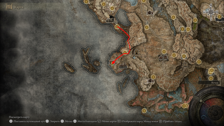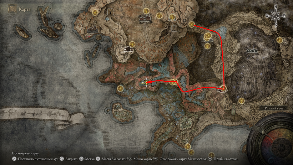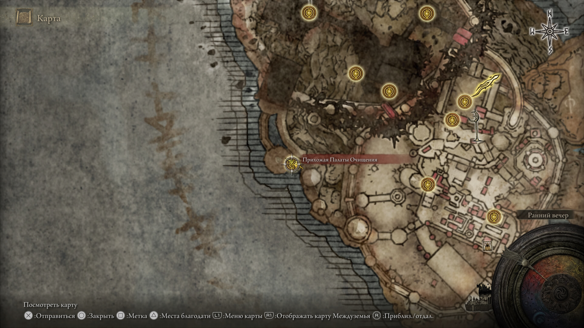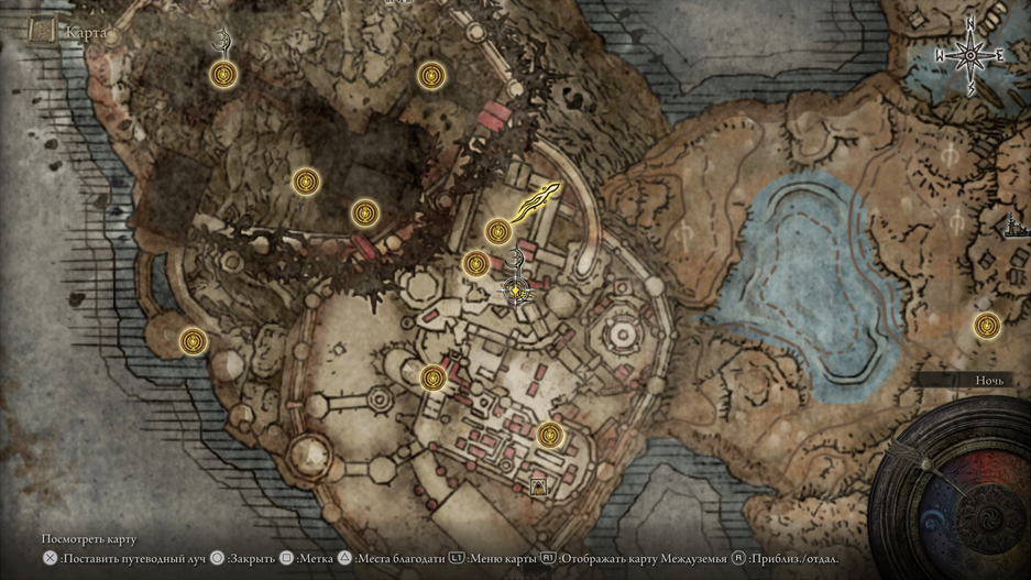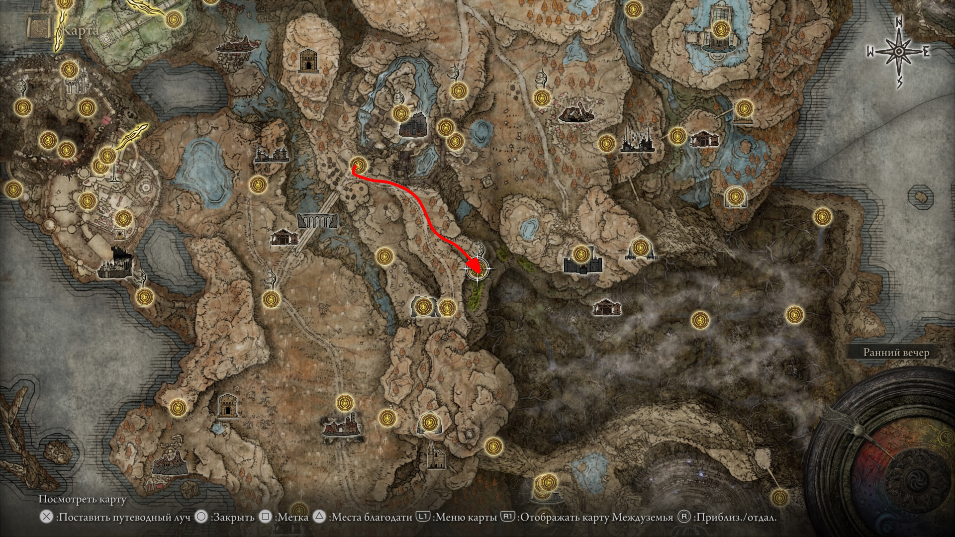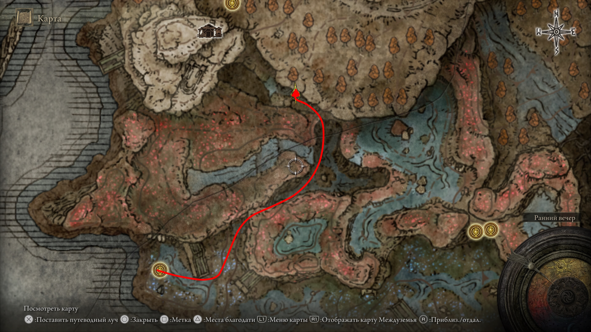 От благодати «Малый частный алтарь» идите вперёд. В месте, где патрулирует Рогатый воин, поверните налево, поднимитесь по лестнице, затем сразу поверните направо, после чего налево до сточного водопада — там ещё один поворот налево. Будьте аккуратны, вас ждёт сразу три засады!