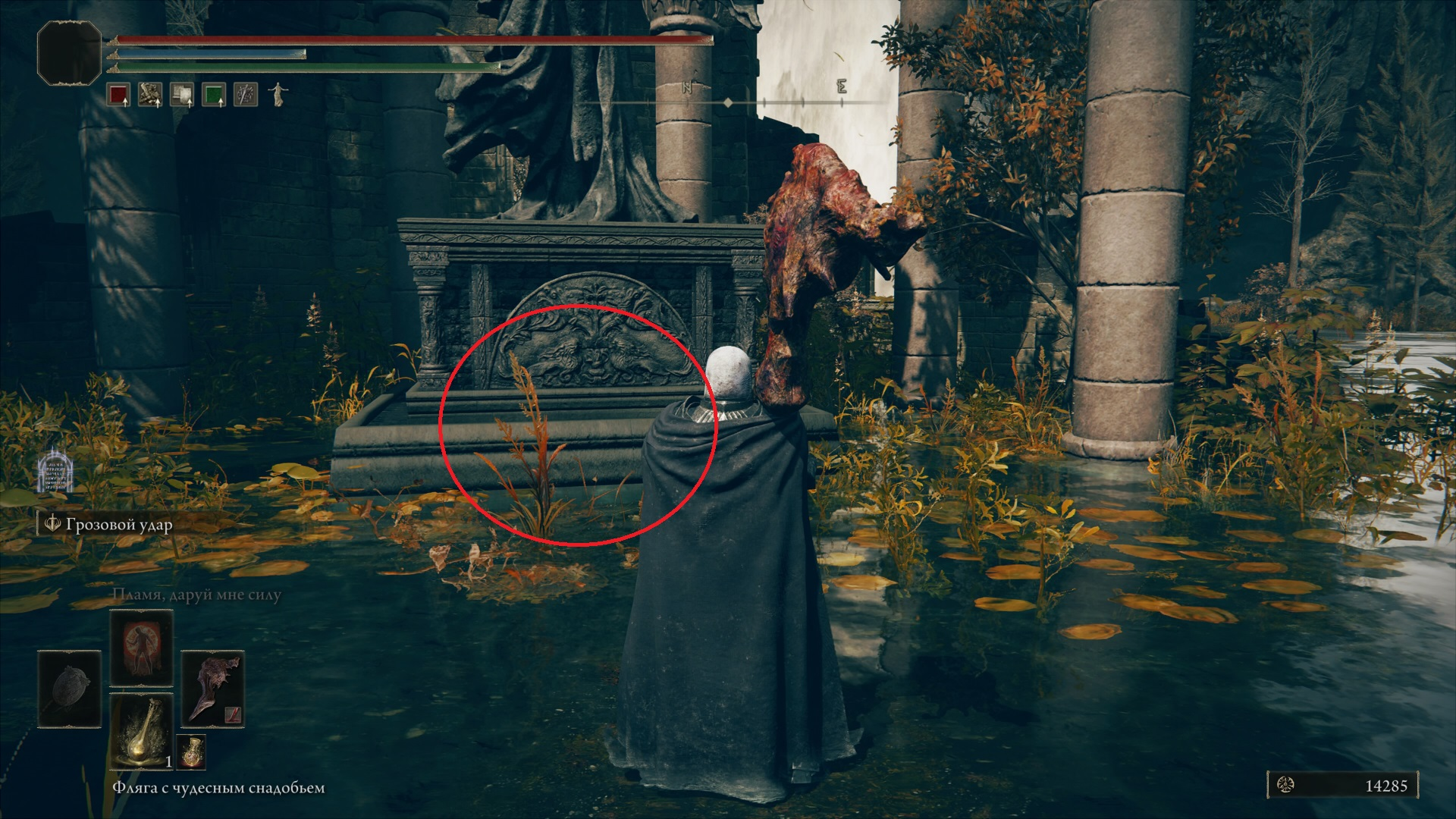 Идите вперёд, там будет картина и пустая стена справа — ударьте по ней и откроется проход, в конце которого будет гроб. Взаимодействуйте с ним. Оказавшись внизу, активируйте благодать «Замковый водопой».