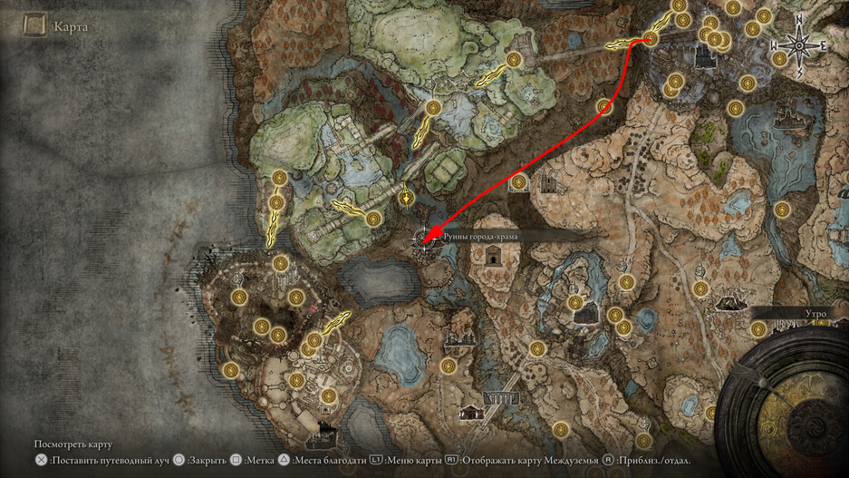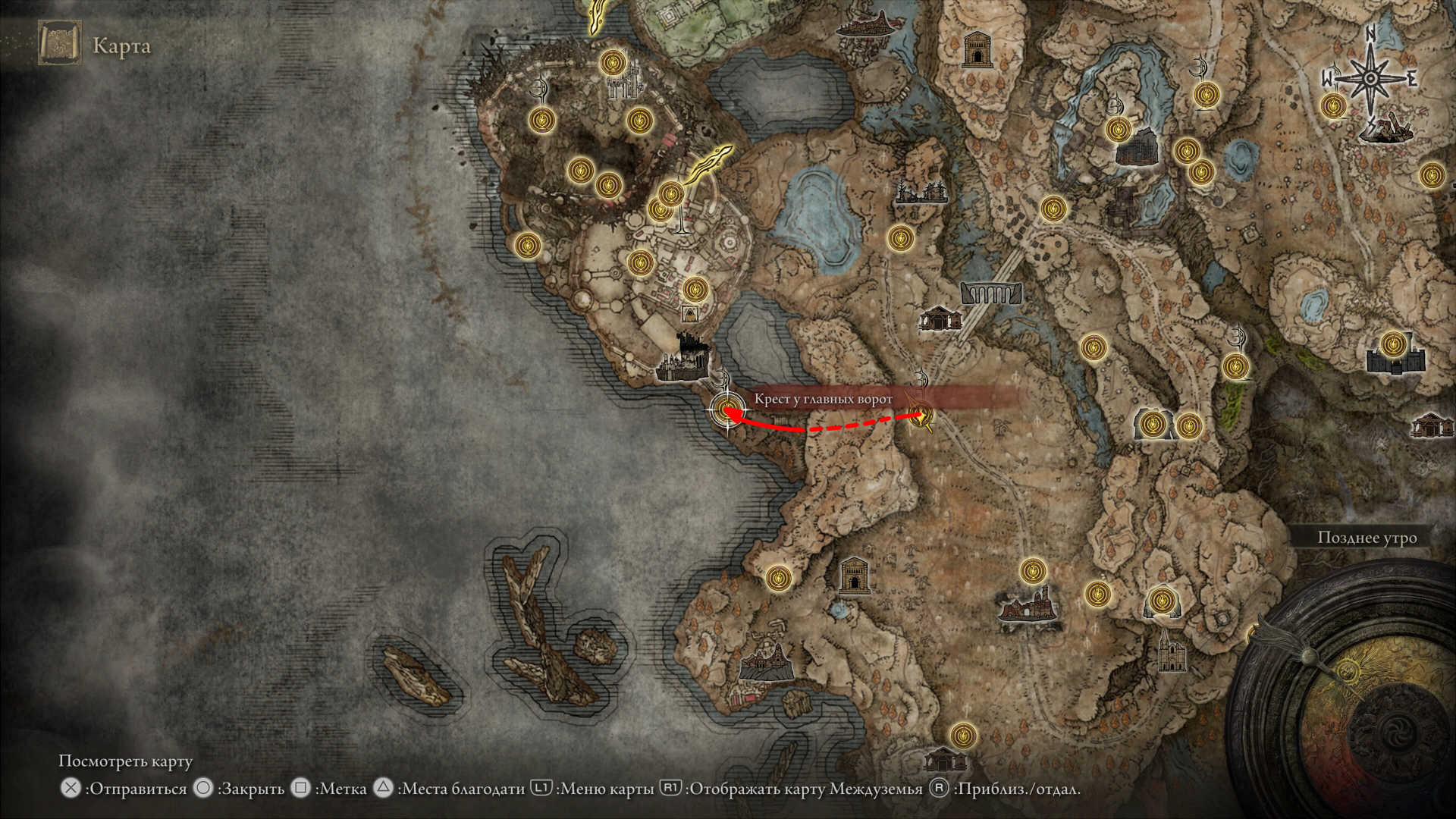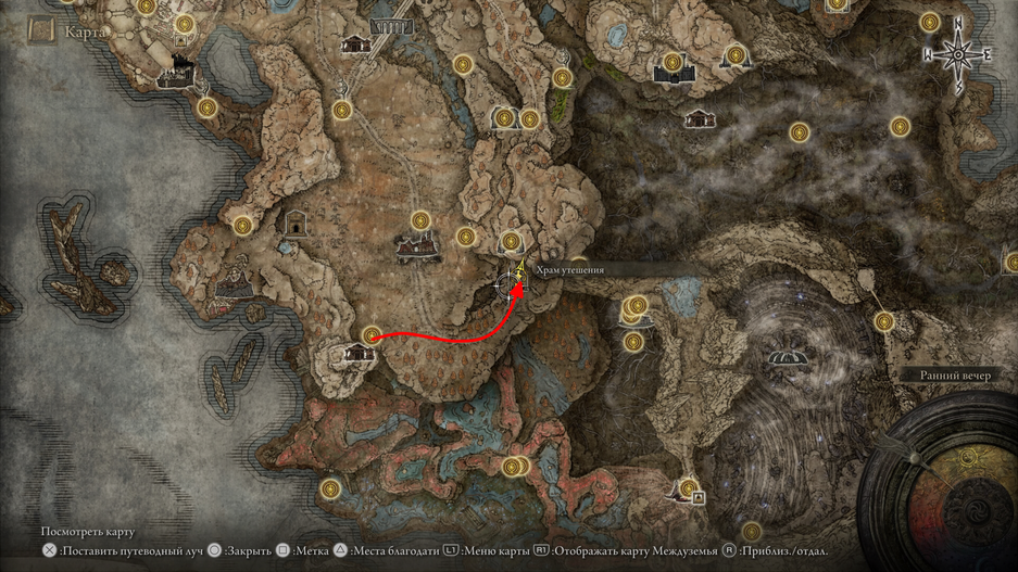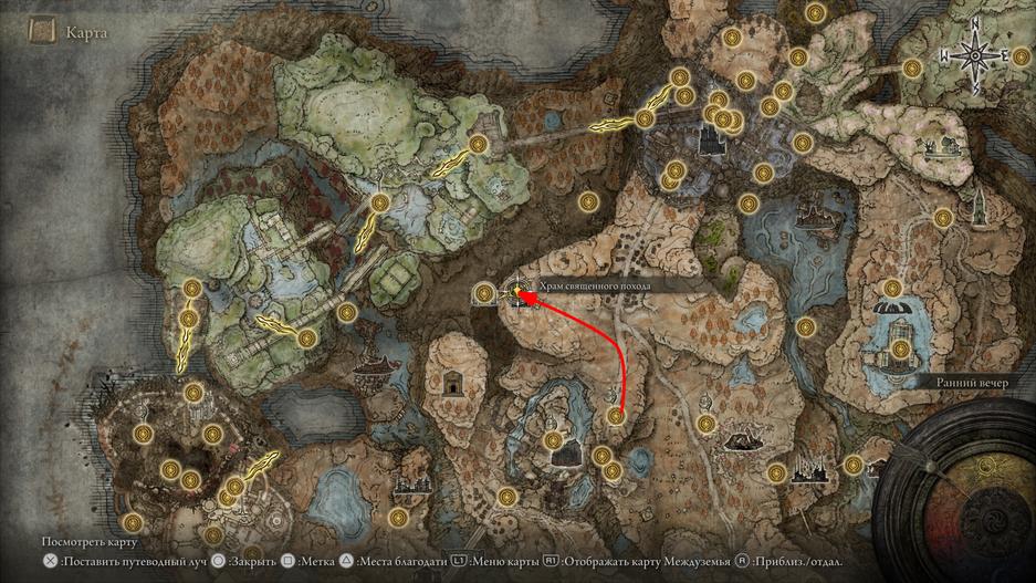 От благодати «Крест у дороги» следуйте на северо-запад. Там располагается локация «Храм священного похода» — сразу 2 осколка будут находится возле статуи внутри него.