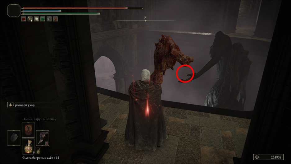 Затем идём дальше — чуть на запад. Там будет ещё два огненных рыцаря и изначально затопленная статуя Марики, в руке которой будет осколок.