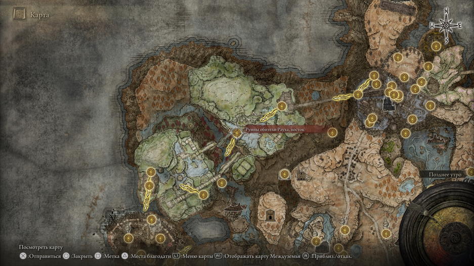 Далее на юго-восток, там вы найдёте локацию «Заброшенная церковь». Там внутри будет благодать «Церковные руины» и сразу 2 осколка возле статуи.