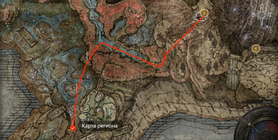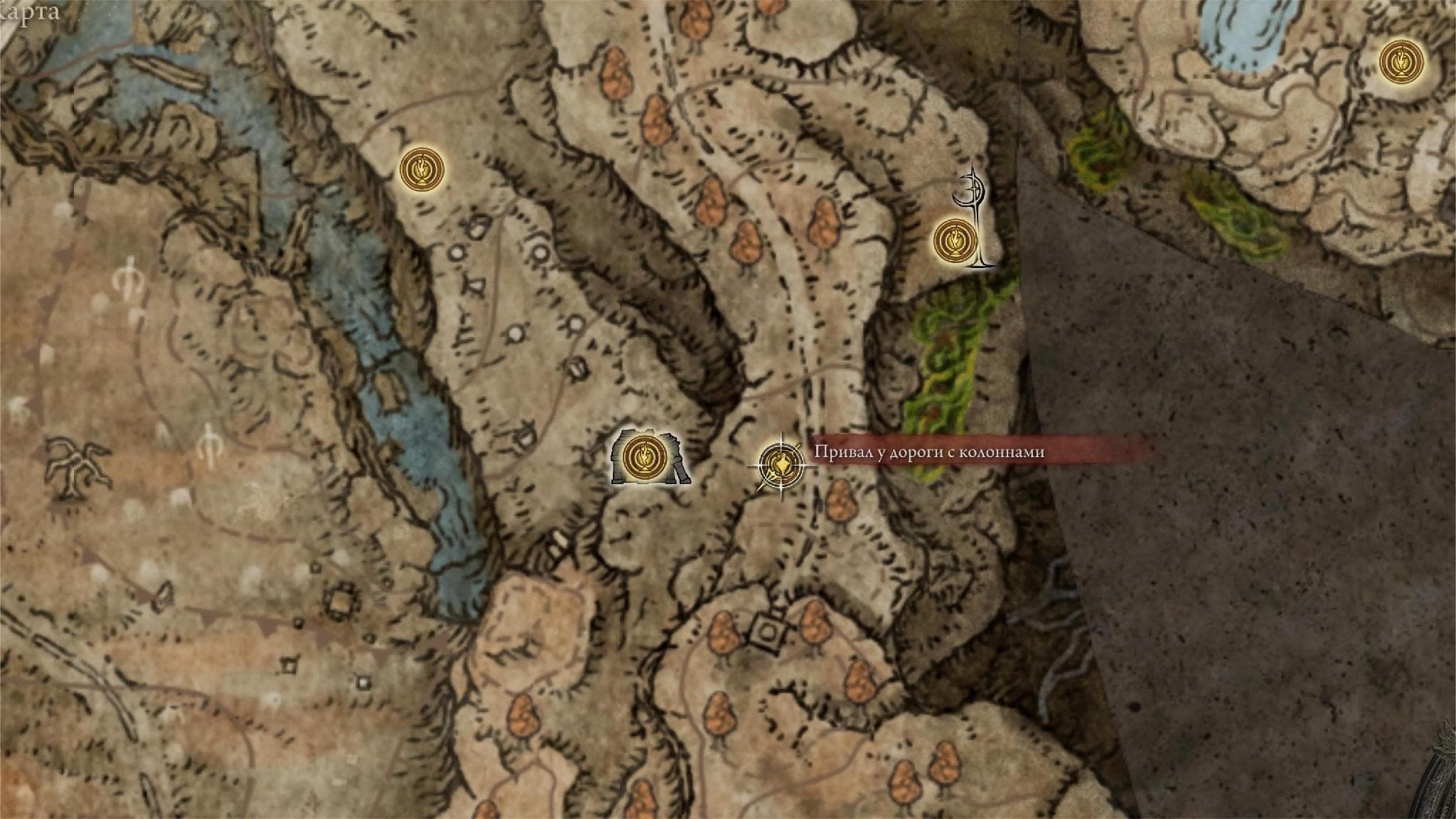 Как только река станет уходить вправо, повернитесь в сторону юга на вашем внутриигровом компасе (символ S) и аккуратно спрыгивайте вниз. Следуйте строго на юг и вскоре увидите обелиск, на котором будет располагаться фрагмент карты региона. Точное месторасположение отмечено на скриншоте ниже.