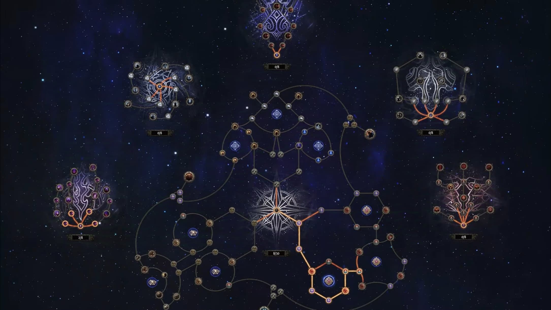 Бонусные очки для древа выдаются за убийство боссов в кампании. Для удобства игроки могут перераспределять очки за золото. В эндгейме также доступны самоцветы, которые вставляются в древо, усиливая отдельные узлы или предоставляя дополнительные эффекты.