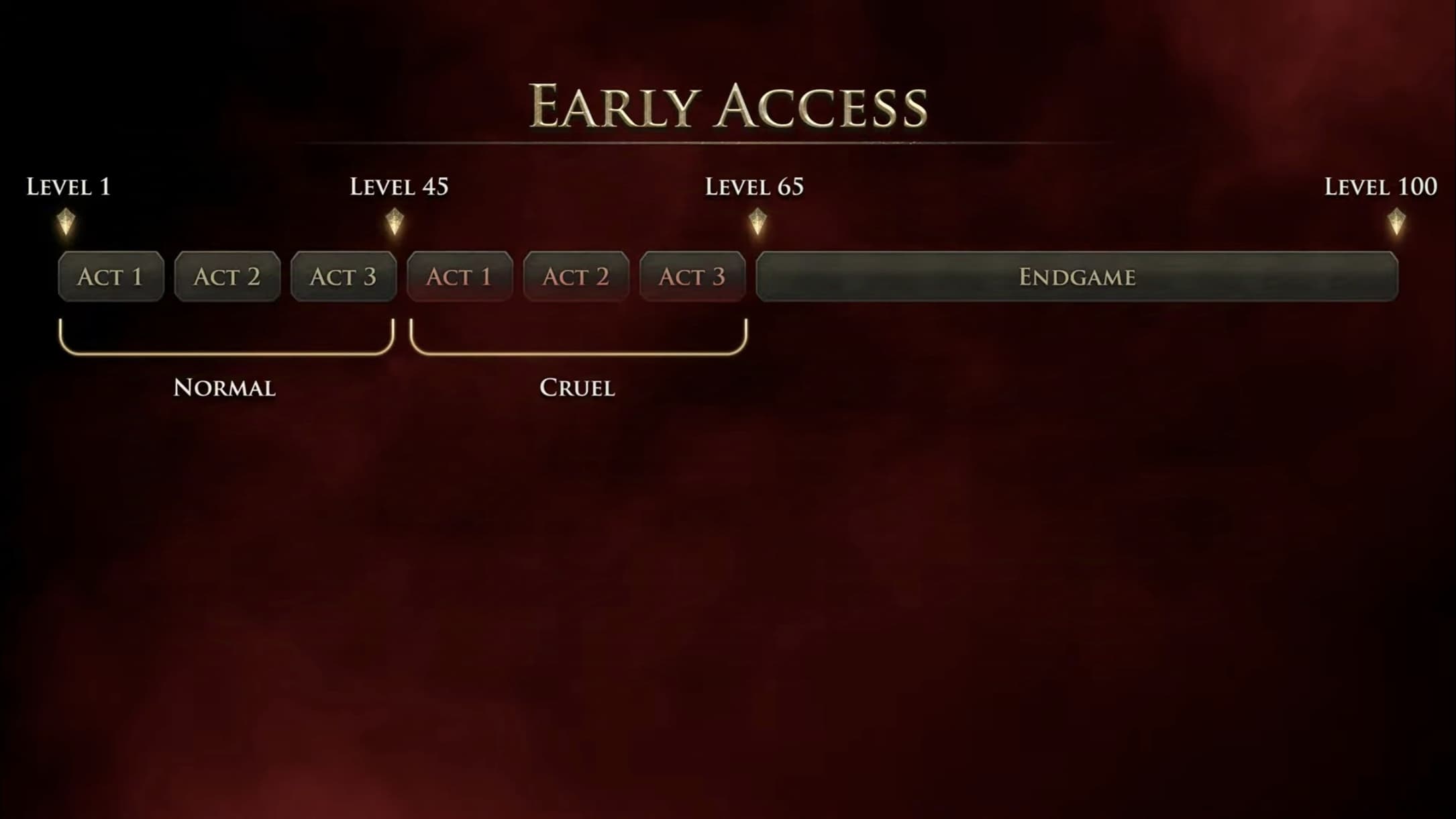 На стадии раннего доступа Path of Exile 2 предложит игрокам кампанию из трёх актов. По завершении этих актов персонажи достигнут приблизительно 45 уровня. Для дальнейшего развития до 65 уровня и доступа к полноценному эндгейму разработчики временно введут уровень сложности «Жестокий», который позволит пройти кампанию повторно.