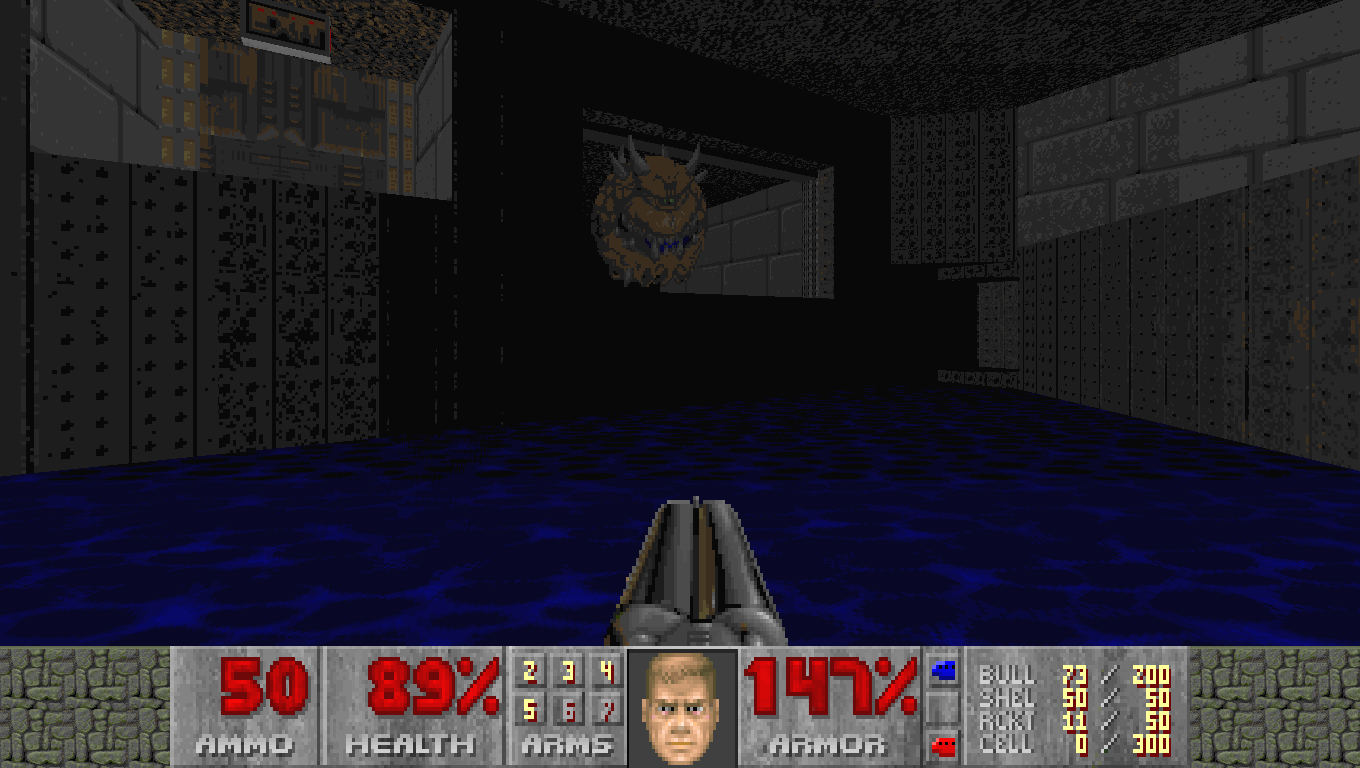 Освещение в Doom стало настоящим откровением. Вместо статичного и равномерного света, характерного для Wolfenstein, здесь появилась динамическая система: мерцающие лампы, полумрак в углах, резкие вспышки во время боёв. Тьма перестала быть просто фоном и превратилась в важный игровой элемент, создающий напряжение — невозможно было точно предугадать, что скрывается в темноте.