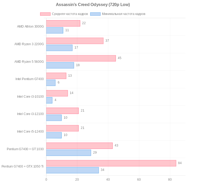 Средняя частота кадров в разы больше, чем способна продемонстрировать Intel UHD Graphics даже на топовых процессорах. Даже на мобильных чинах, где у Intel не всё так плохо, Ryzen 5 5600U превзошёл Core i7-1165G7. И можно было бы праздновать, но праздник портит совсем неигровая Nvidia GT 1030, которую десктопные процессоры смогли лишь догнать.