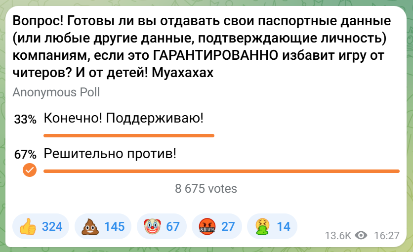 И в качестве опровержения, наш главный редактор Виталий Казунов в Telegram-канале провёл аналогичный опрос подписчиков на готовность предоставить паспортные данные ради борьбы с читерами. В исследовании приняло участие более 10 500 человек и 67% оказались «Решительно против» подобной инициативы.