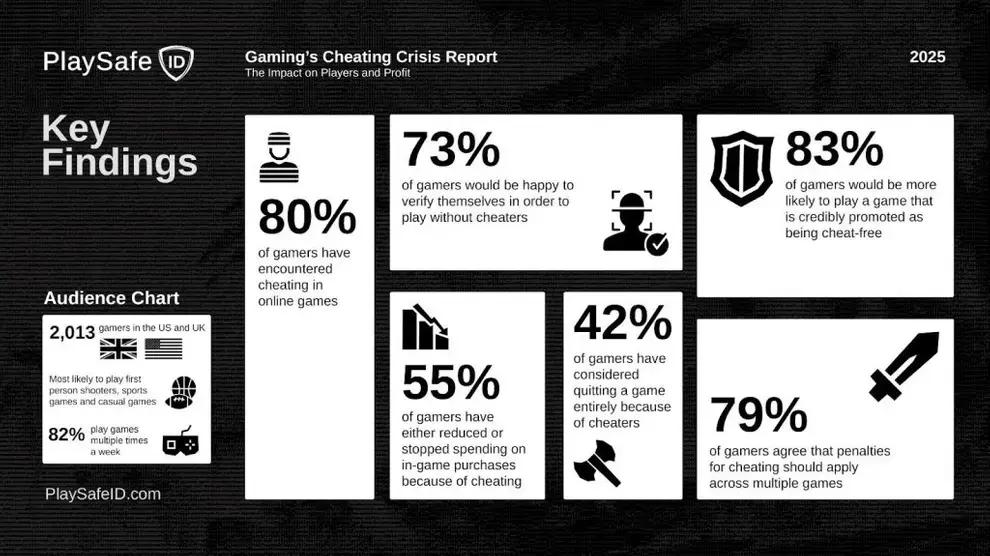 Несмотря на риски потери приватности, 73% респондентов заявили в готовности пройти верификацию личности, например через паспорт, если это обеспечит честную игру. А 83% опрошенных отметили, что с большей вероятностью будут играть в проекты, открыто заявляющих о своей защите от читеров. Ещё один важный вывод исследования — 79% опрошенных считают, что наказание за читерство должно распространяться на все игры, а не ограничиваться лишь конкретным тайтлом, в котором был зафиксирован факт нарушения.