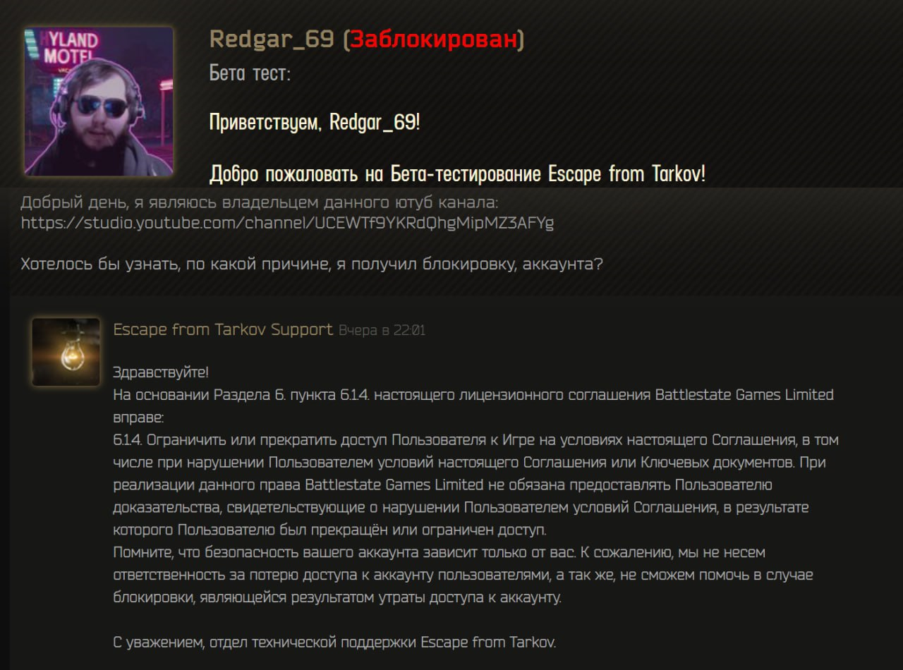 Юридическая основа этой практики закреплена в пользовательском соглашении Battlestate Games: компания оставляет за собой право прекращать обслуживание учетной записи без обязательства возврата денежных средств. На этапе закрытой беты эта формулировка уже приводила к множеству конфликтов. Пользователи, инициировавшие возврат через банк или через службу поддержки нередко получали уведомление о блокировке аккаунта, но деньги при этом не возвращались. В результате единственным эффективным способом добиться возврата становилось обращение в банк и последующее оформление претензии на основании законодательства о защите прав потребителей.