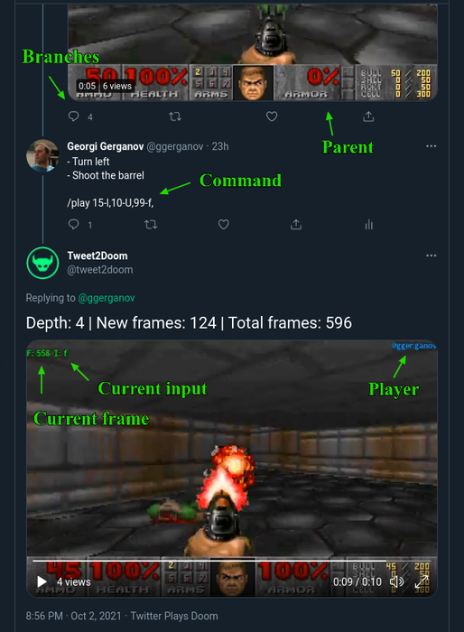Проект Tweet2Doom работает так: вы отправляете команду или условный набор действий, бот воспроизводит это в игре и публикует короткое видео с результатом. Дальше вы отвечаете на твит — и продолжаете с того состояния, на котором остановились.