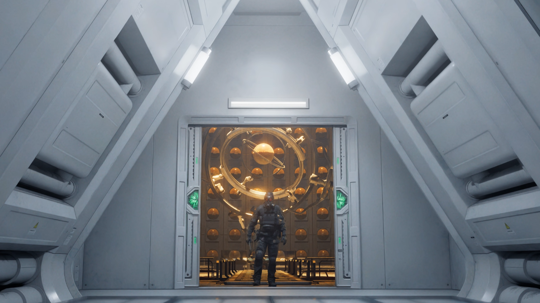 Затем она вернулась к панели и вставила вторую сферу. Красная дверь открылась, открыв просторное белое помещение с центральной консолью и множеством мониторов.