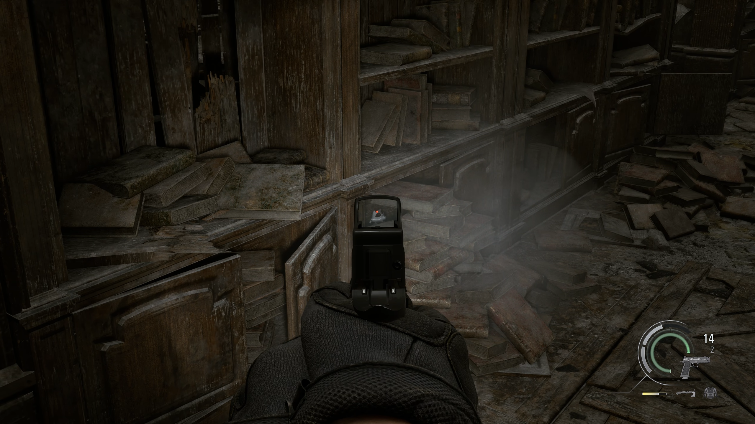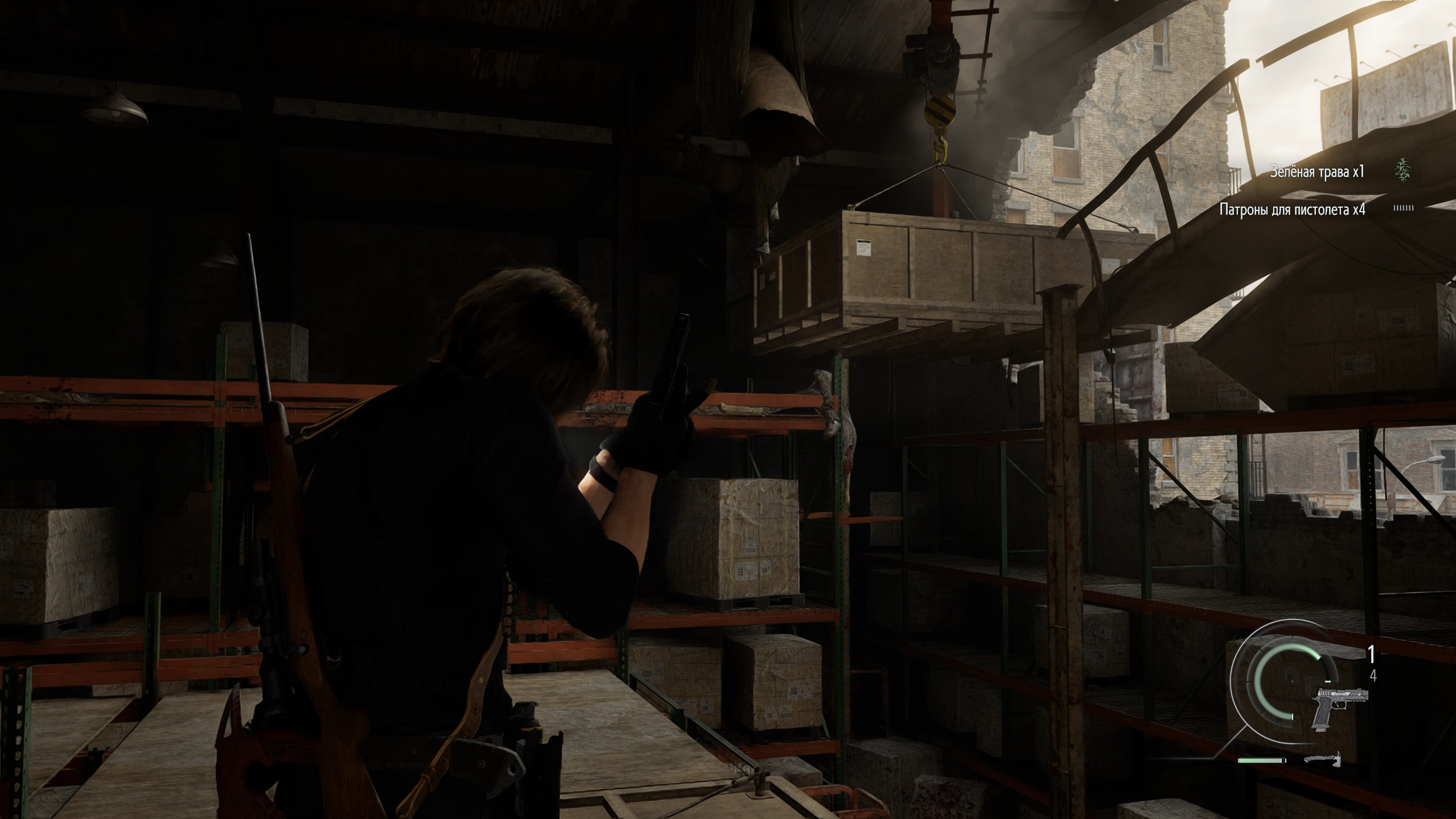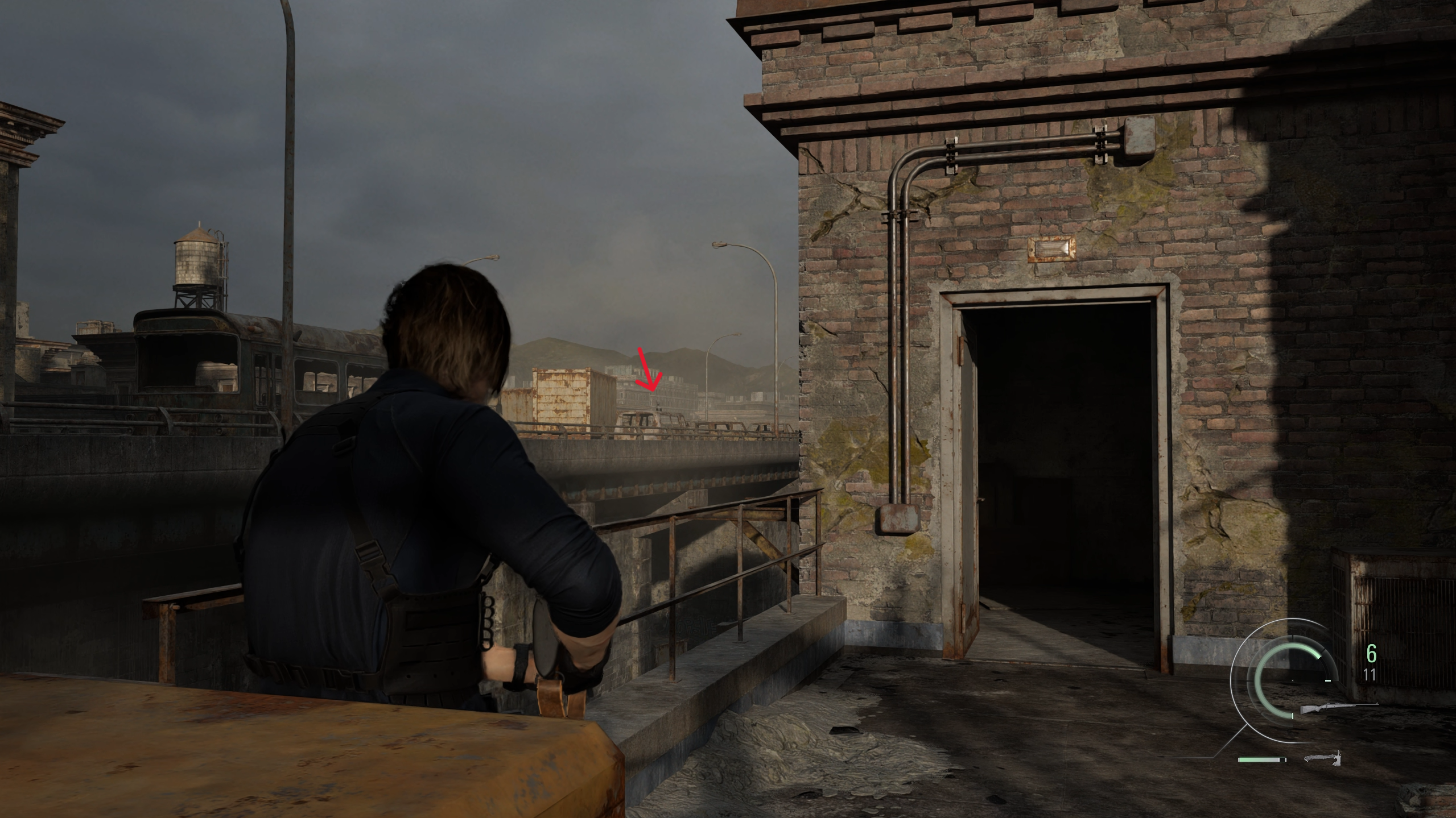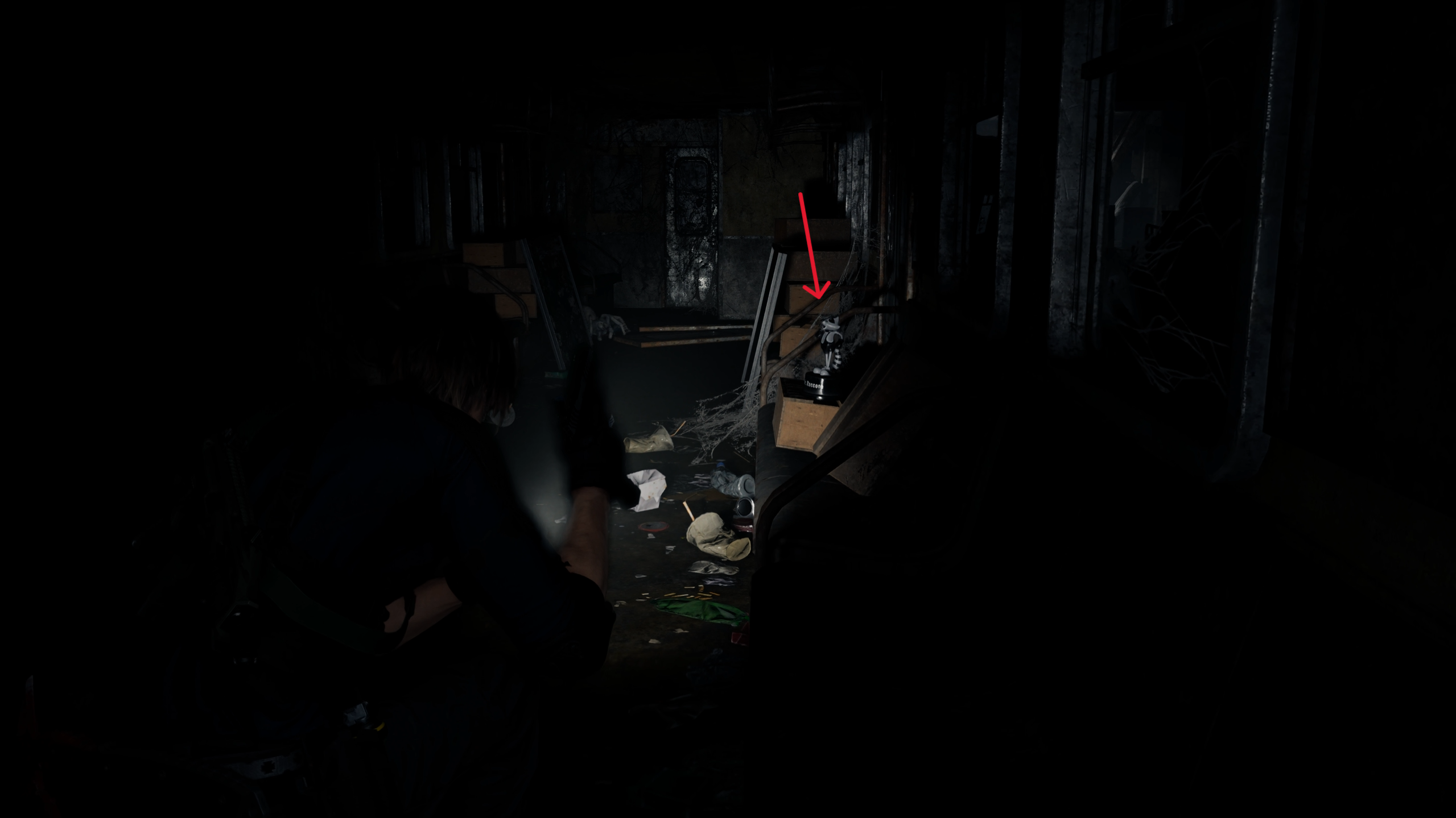 Грейс расчистила путь, и кран больше не перекрывал лестницу. Леон поднялся наверх и оказался в задней комнате. Он разбил два ящика с ресурсами и взял со стола патроны для «Реквиема».