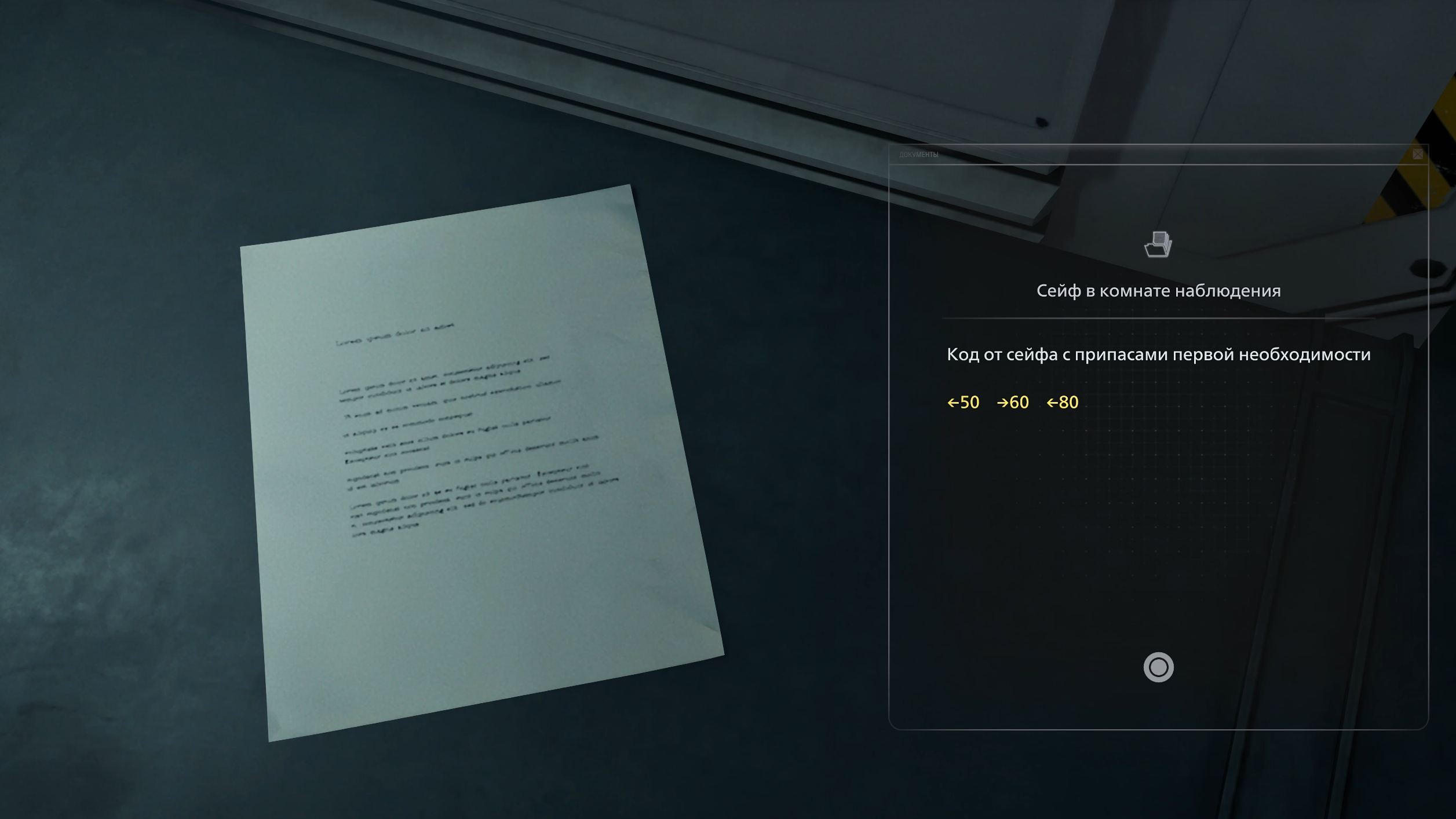 В правом контейнере оказались набедренная сумка и пустая бутылка, в левом — патроны для пистолета. Чуть дальше, в открытом контейнере, лежали обломки. У лестницы её ждали ещё два лизуна и заражённый. Грейс повторила приём с приманкой и кислотой, после чего забрала дополнительные обломки. Под эстакадой нашёлся ещё один контейнер с обломками и кодом к сейфу в комнате наблюдения: влево 50, вправо 60, влево 80.