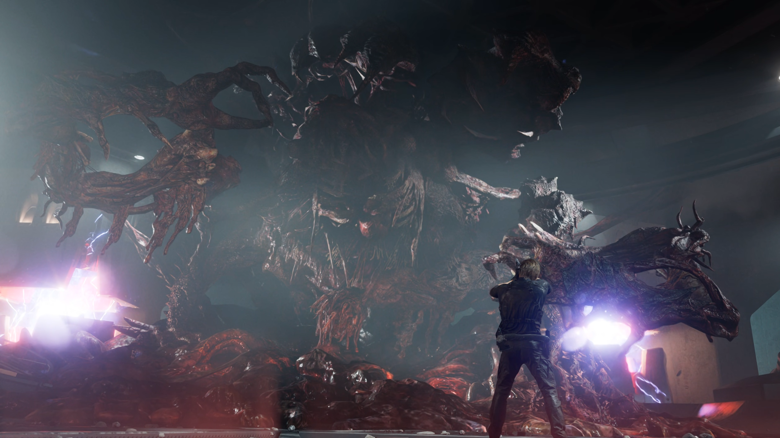Тварь пыталась достать его щупальцами. Леон уклонялся в стороны, а когда не успевал — парировал атаки. На теле монстра появлялись светящиеся наросты, и Леон отстреливал их по мере появления.